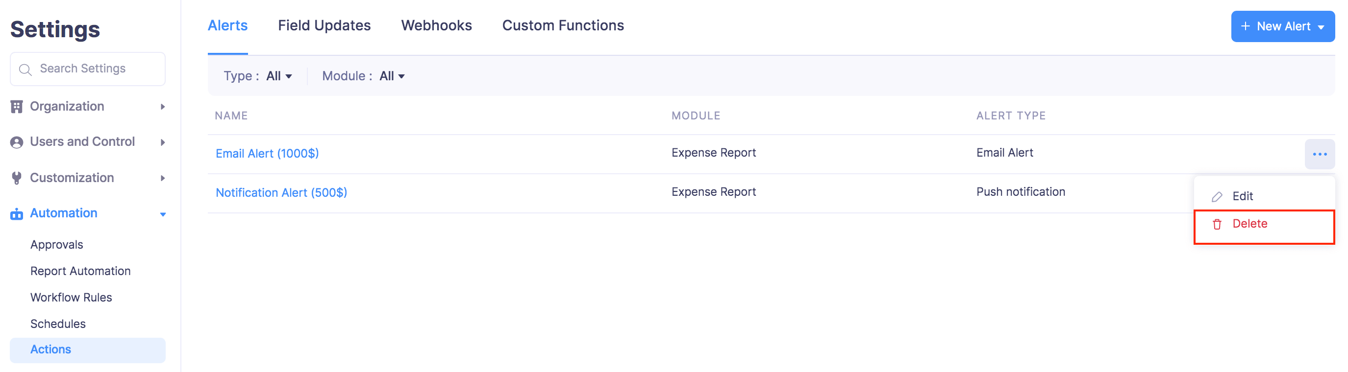 - Under the Alerts tab, hover over the alert you want to delete and click the More icon next to the alert.