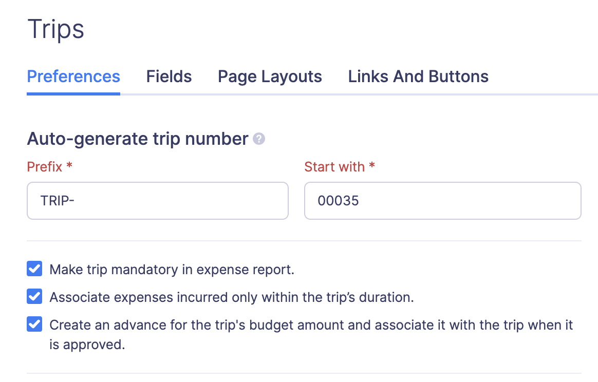 Admins can configure preferences regarding trip submission, trip notifications, trips’ custom status, and other preferences.
