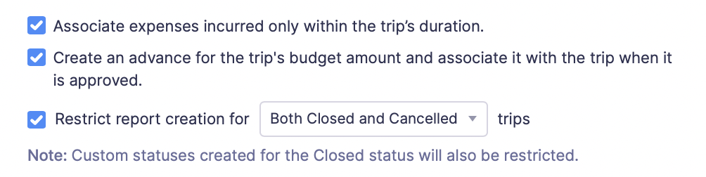 Note: Custom statuses created for the Closed status will also be restricted if you restrict report creation for the trips in Closed status.