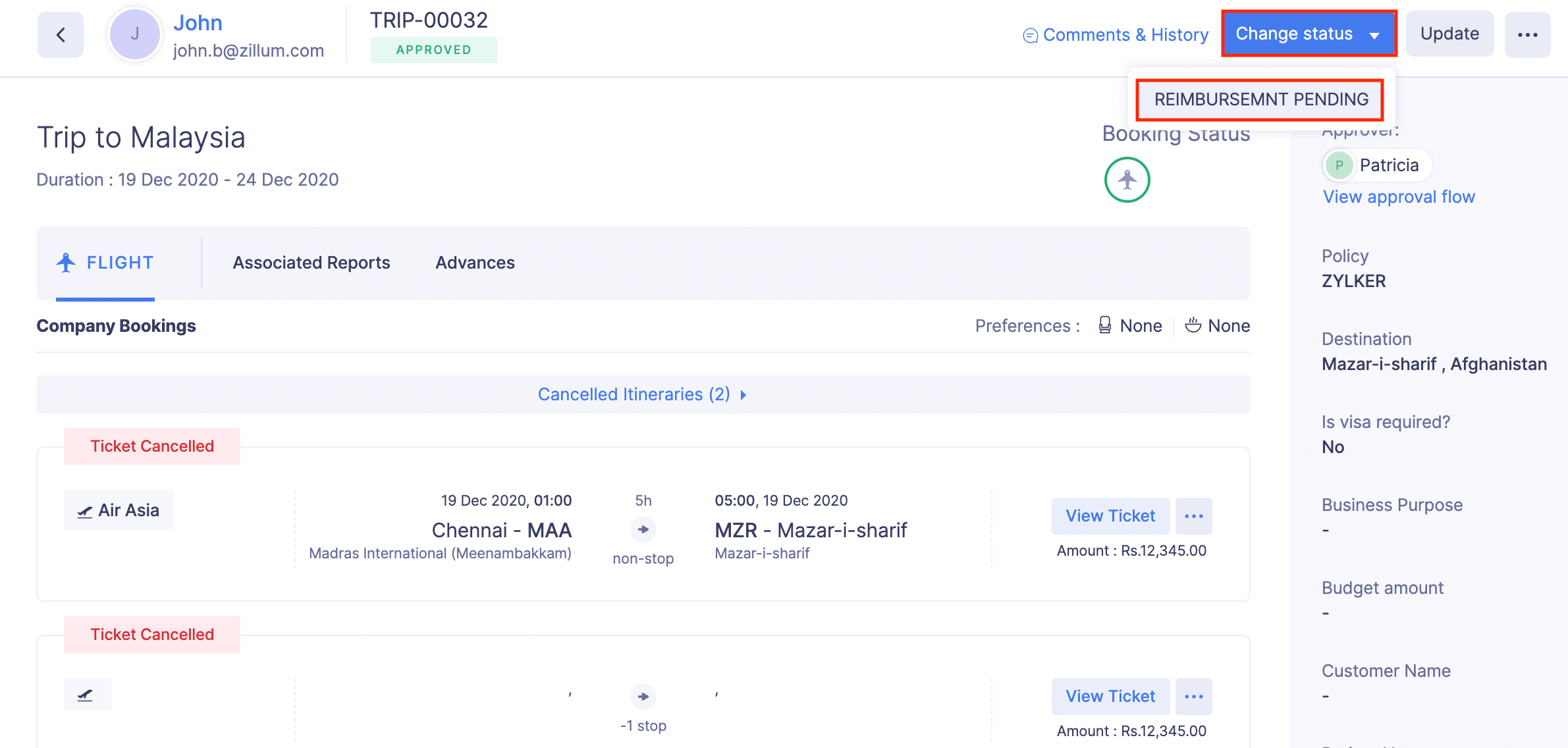 Note: Changing the status of the trip will only change the status name. The trips will still be considered as Approved, Rejected, or Closed based on your configuration.