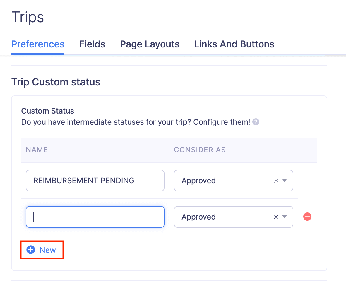 If the trips in your organization include intermediate statuses for the default status Approved, Closed, and Rejected, you can add them by creating custom statuses.