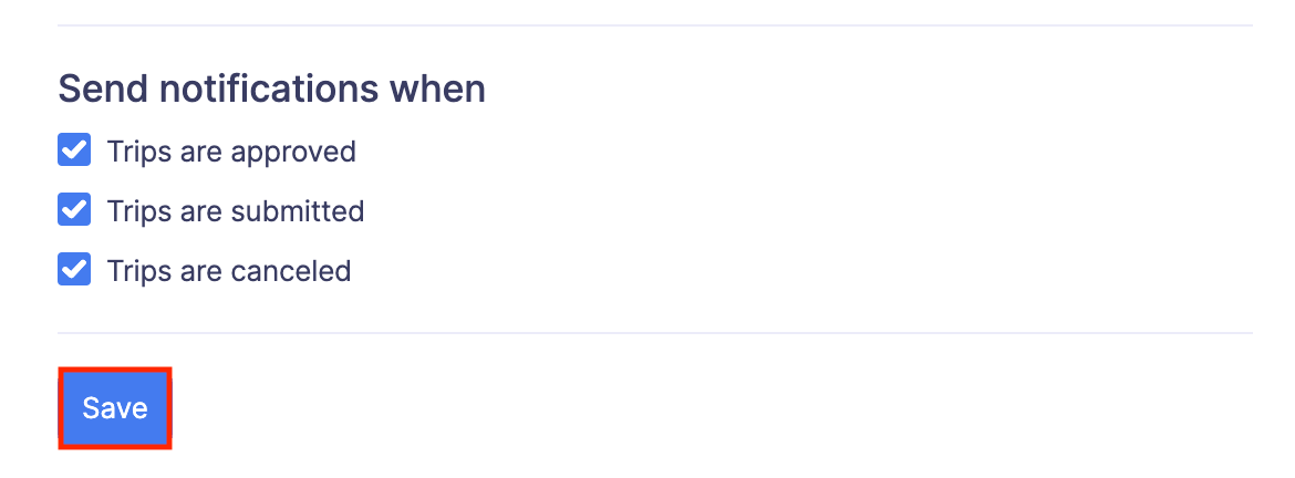 | Trips are submitted | Mark this checkbox to notify users when a trip is submitted for approval. |