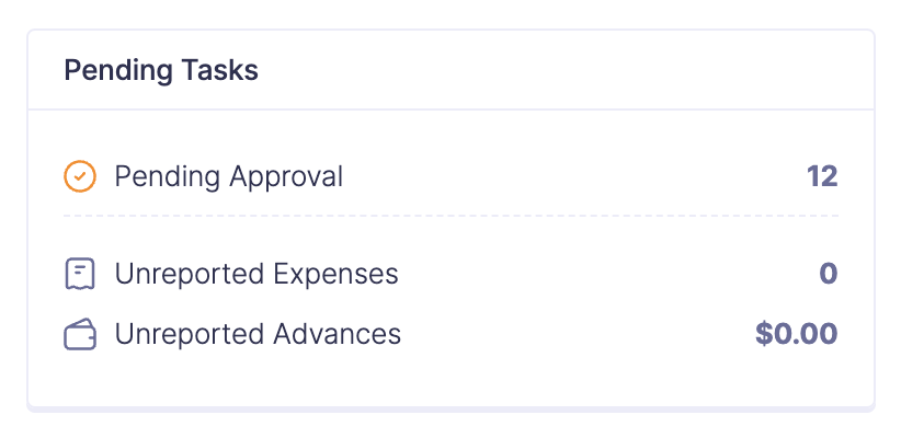 You will be able to view the count of your pending approvals, unreported expenses, and advances under this section.