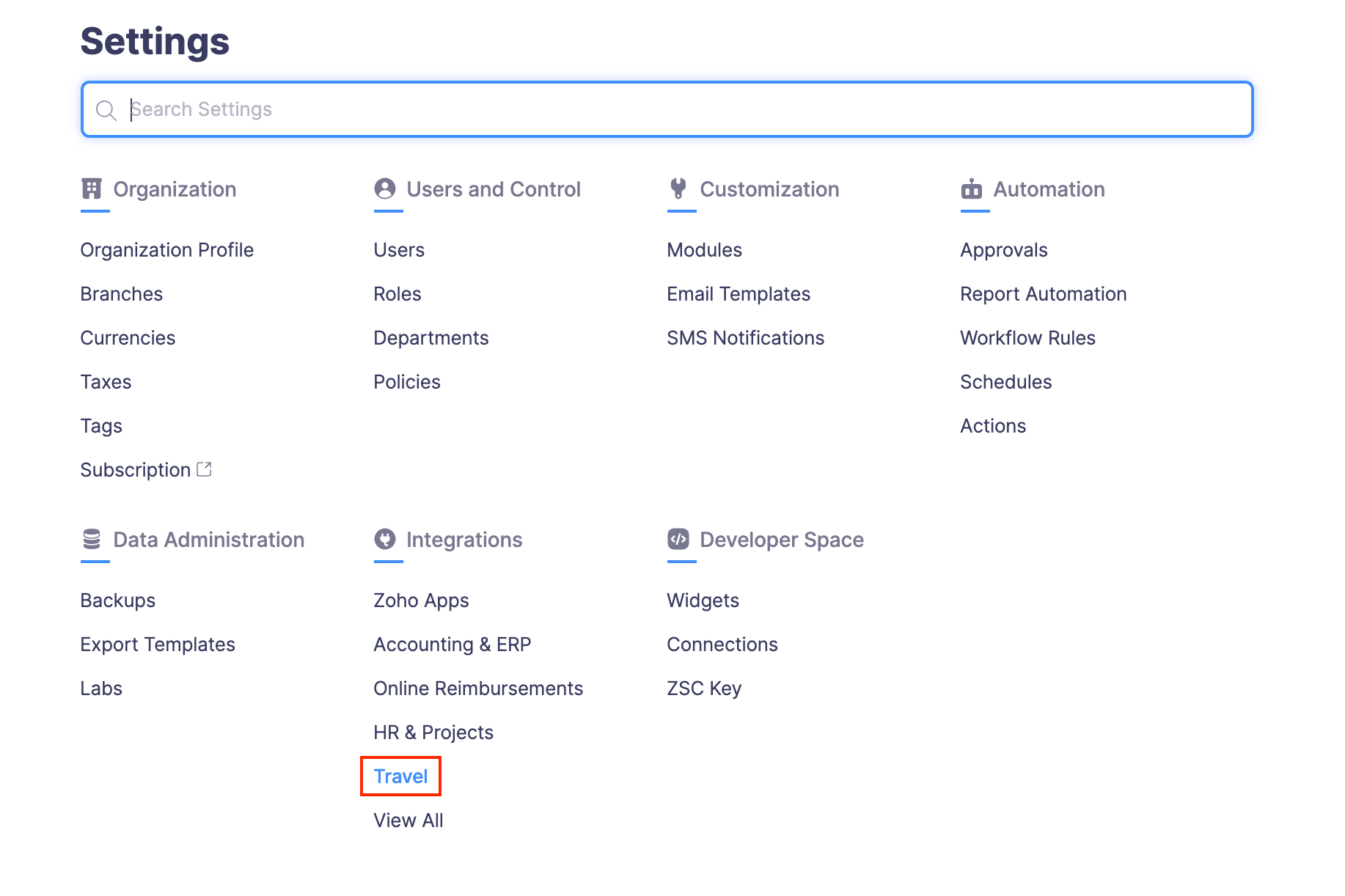 Go to Settings on the left sidebar. - Go to Travel under Integrations.
