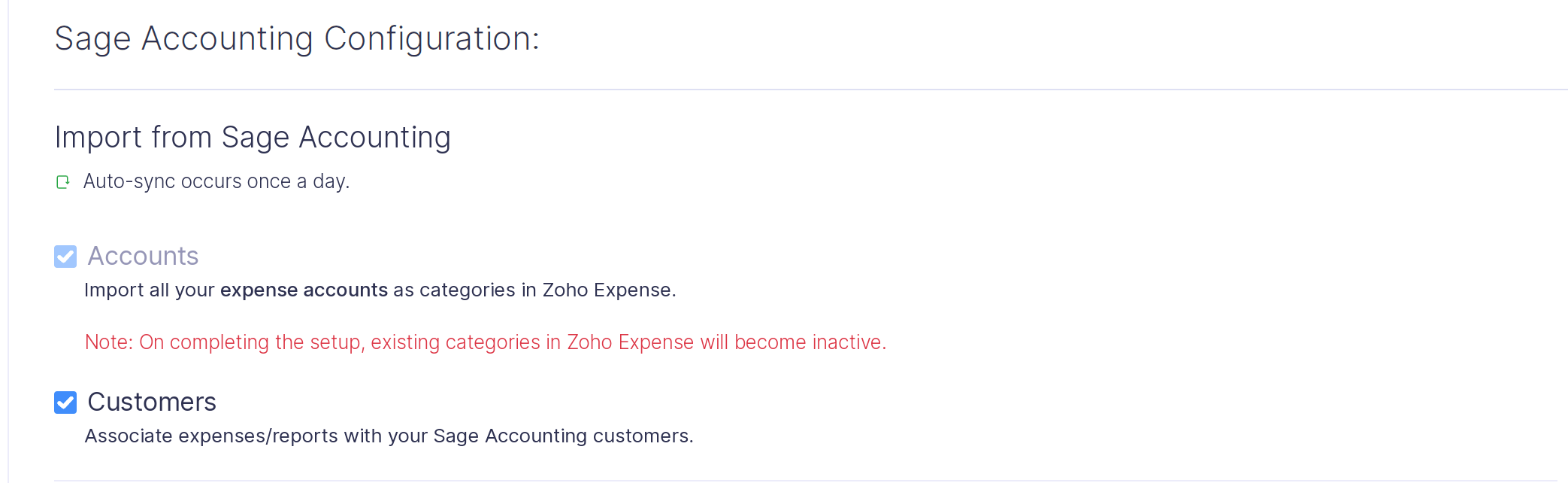 Accounts: The accounts in Sage Accounting can be imported as categories into Zoho Expense. As a result, the existing categories in Zoho Expense will become inactive.