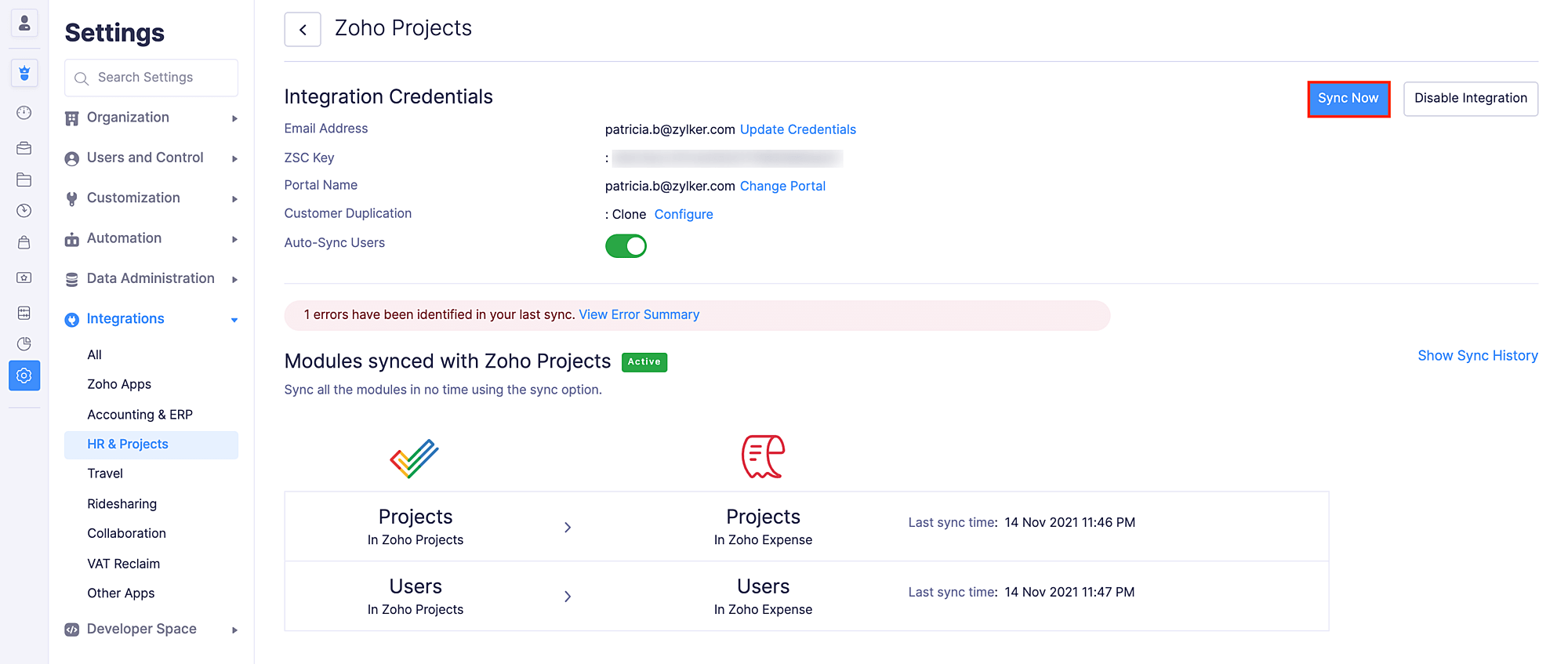 If the records being synced have any errors or if there are any failures while syncing, you can view them by clicking View Error Summary. After resolving the errors, click Sync Now to ensure all unsynced projects, customers, and users are synced.