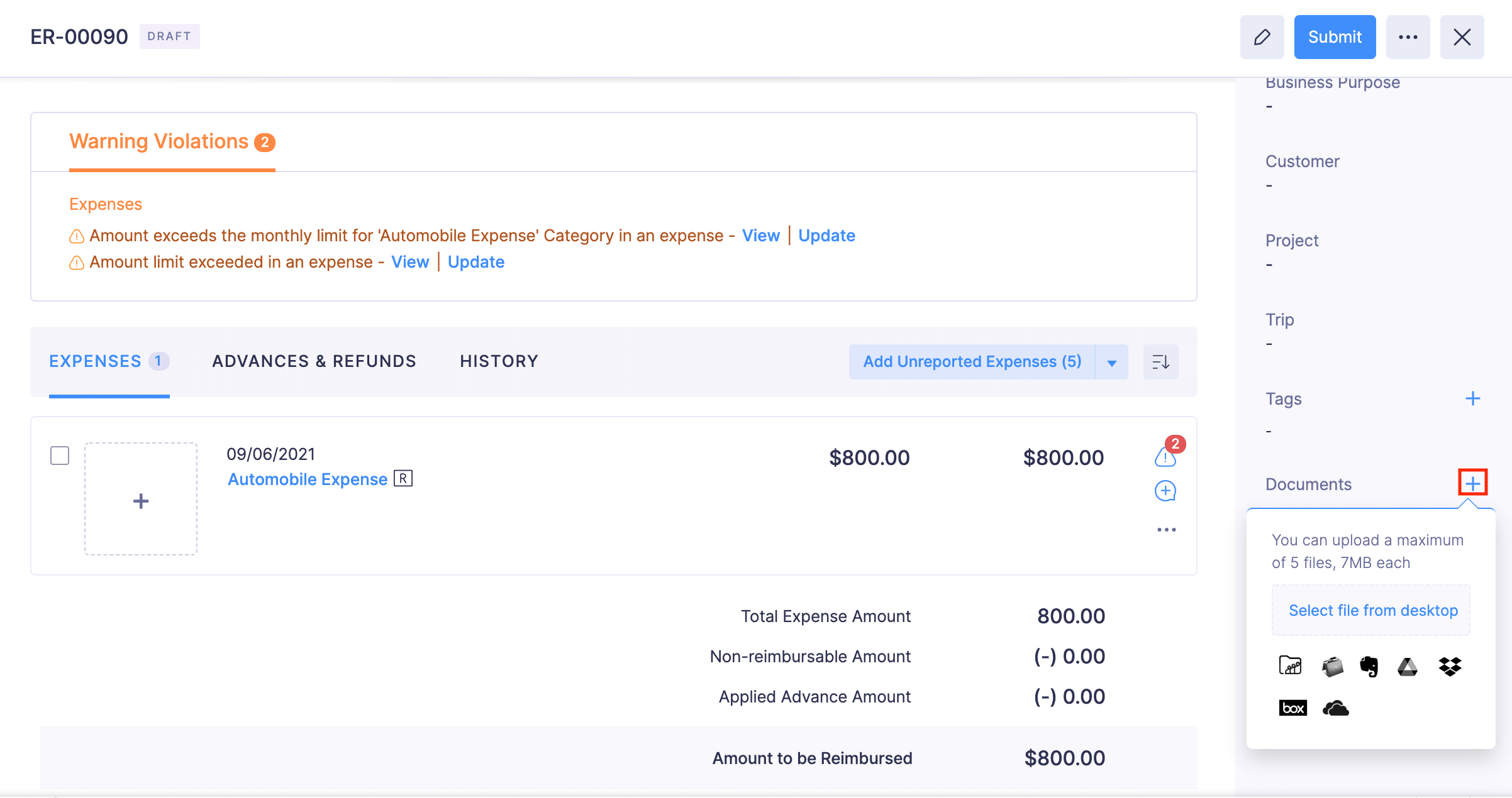 Scenario: John has received an approval statement for a business trip from his manager. While claiming reimbursement for the expenses incurred during the trip, it will be convenient for John’s manager to view the approval statement along with the expense report. In this case, John can attach the approval statement along with the expense report making it easy for his manager to review the report.