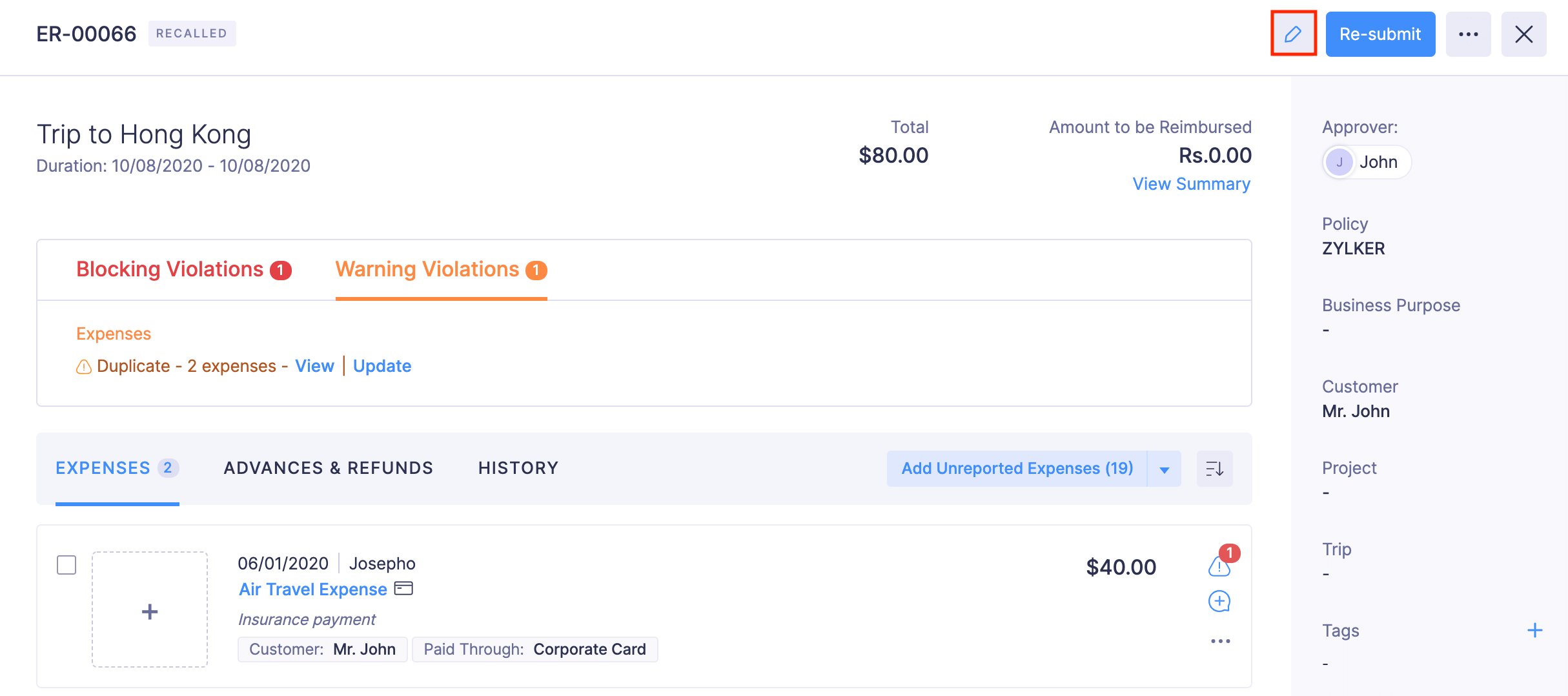 8. After editing the report, click the Re-submit button to submit it for approval again.