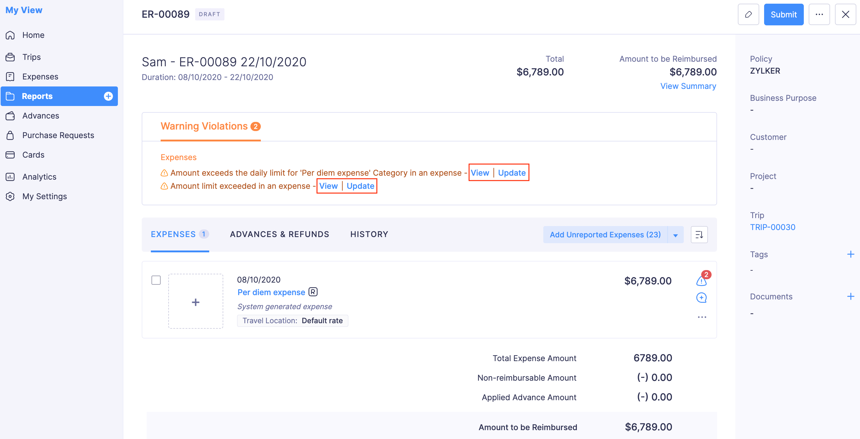 If your report or the expenses in the report have violated your organization’s policies, the violations will be highlighted in the report. You can resolve the violations and submit the report. There are two types of policy violations: