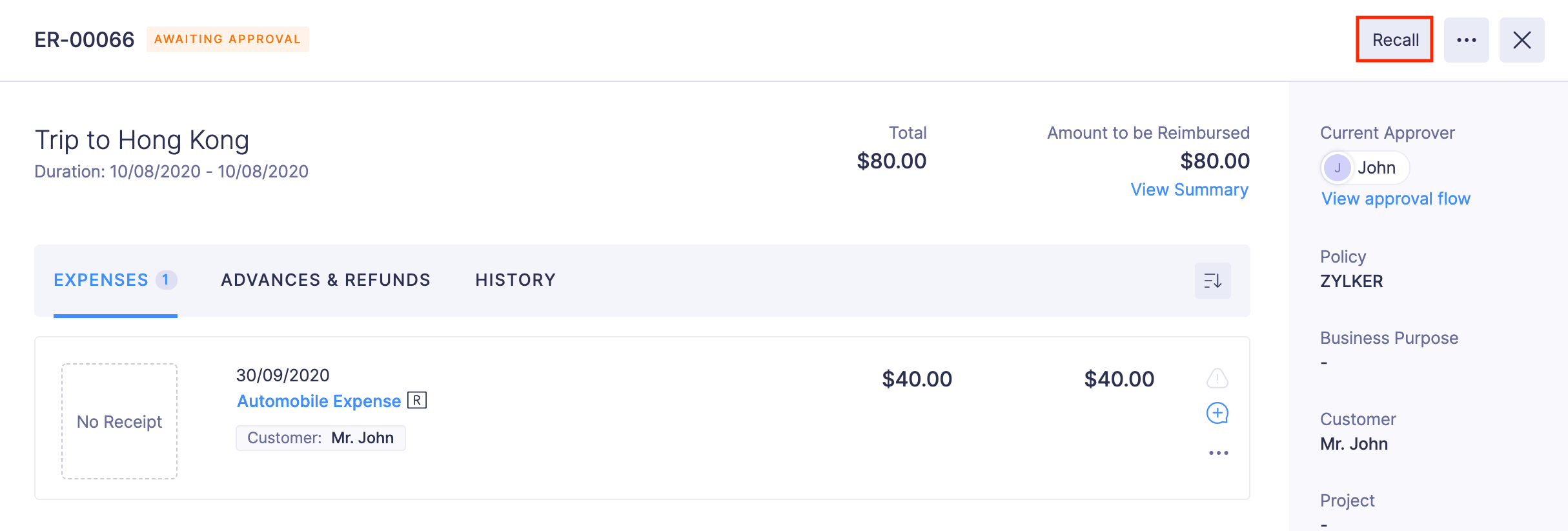 Note: While recalling a report, a notification email will be sent to your approver that you’ve recalled the report.