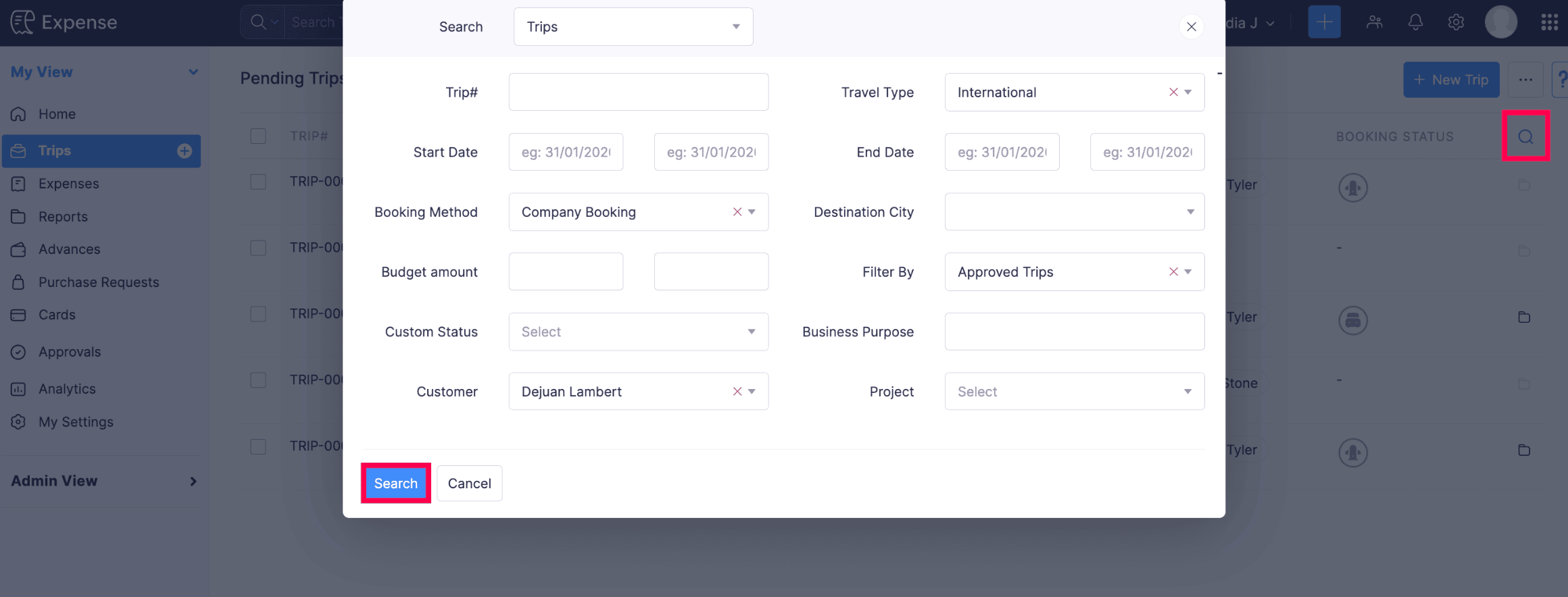 Prerequisite: You cannot archive the trips in Awaiting Approval or Pending Approval statuses.
