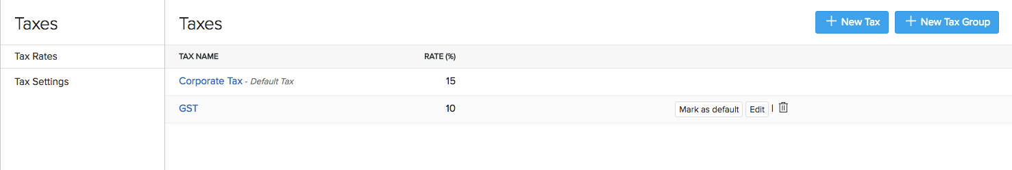 Note: To mark a different tax as default, hover your mouse over the tax you wish to select as default. You will find the mark as default button appearing next to the tax. Select it to make the tax a default tax.