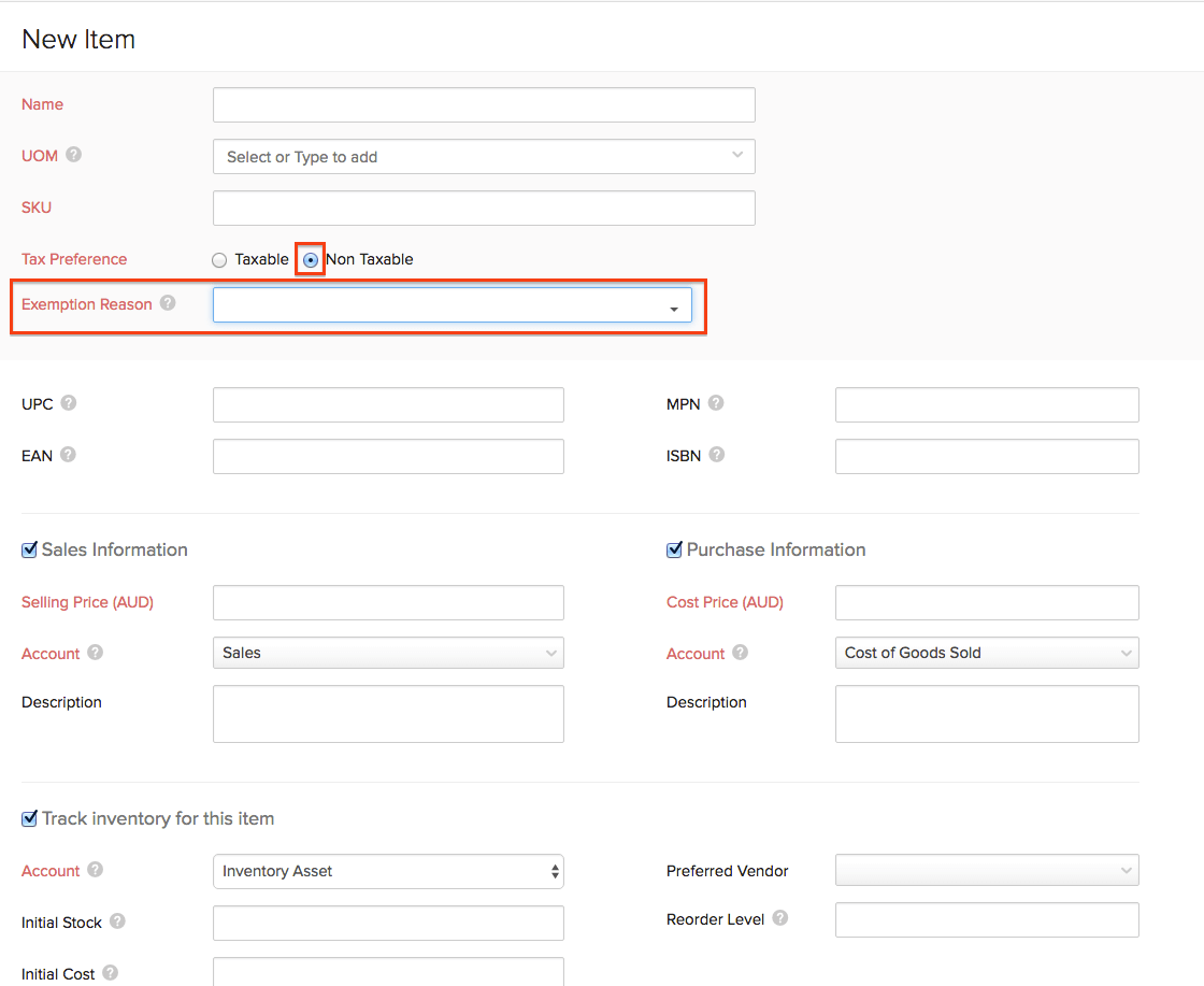 Exemption Reason Users have to select why a customer / transaction / item is exempt from sales tax. Ex: GST FREE, GST FREE EXPORT and INPUT TAXED SALES.