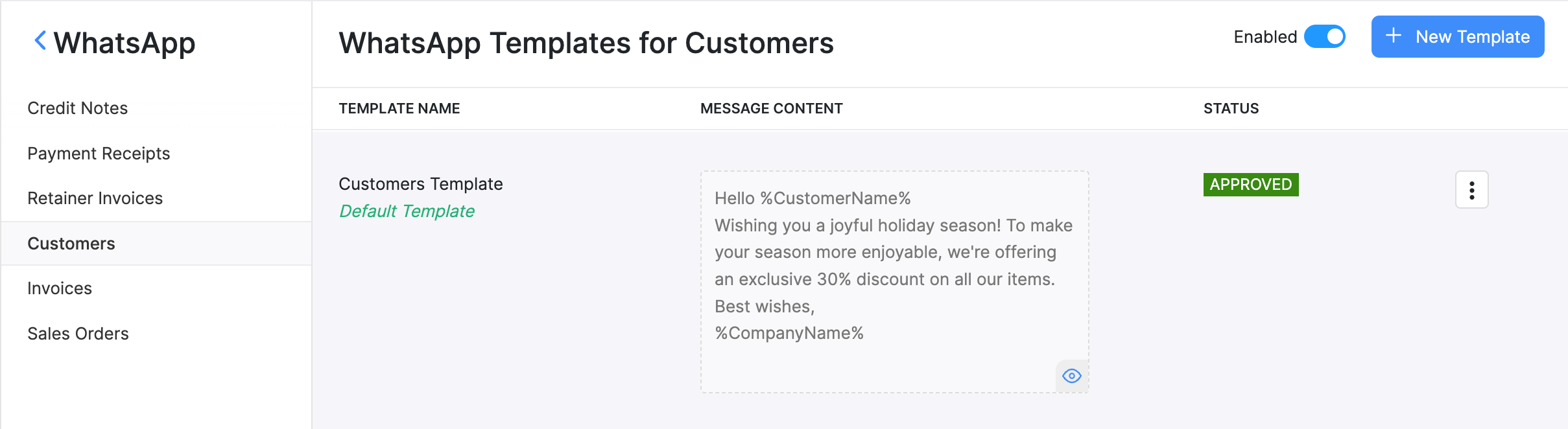 To send notifications through WhatsApp, create a template in Zoho Inventory and get it approved by the WhatsApp Business team.