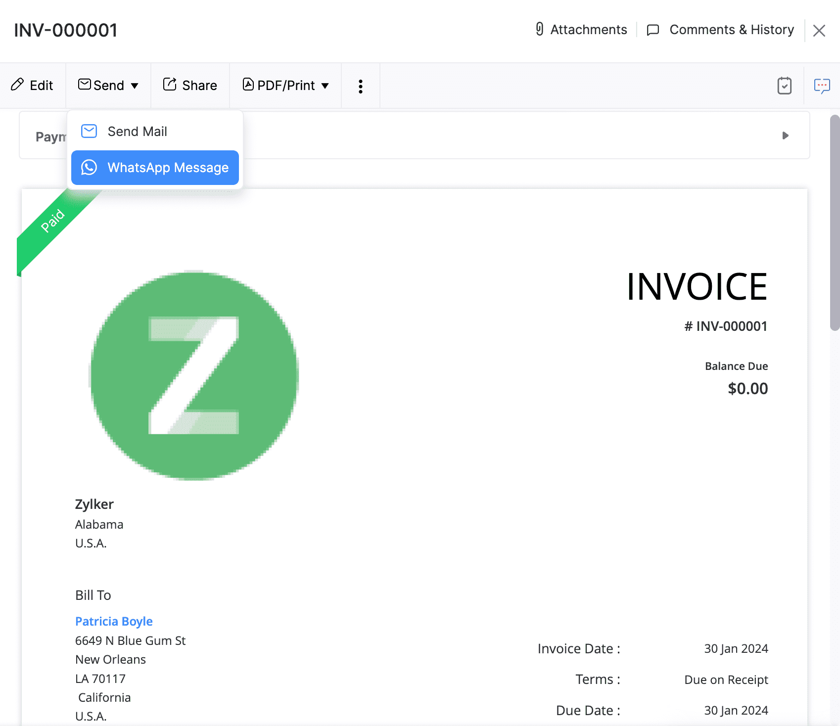 - Mark the Include a PDF attachment along with this message checkbox if you want to include the invoice PDF in the WhatsApp message.