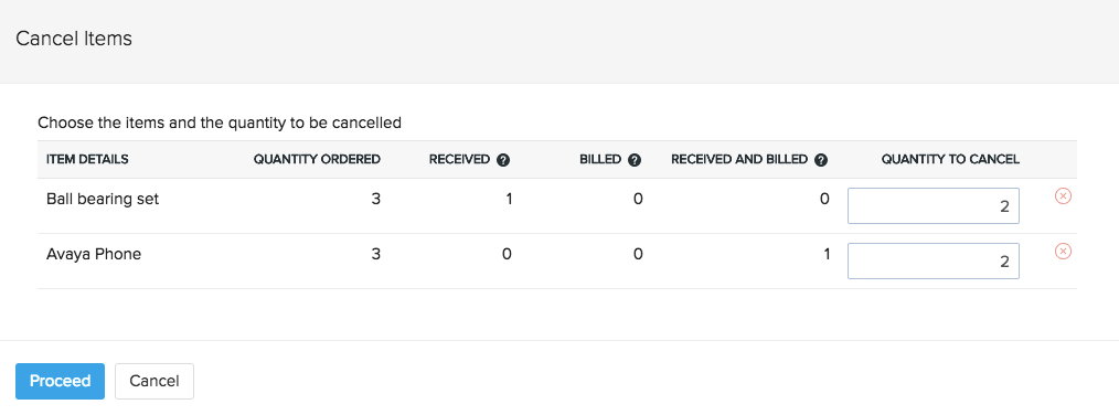Insight: The quantity to cancel for each item is calculated automatically. You will only be able to cancel from the remaining quantity that has not been billed or received.