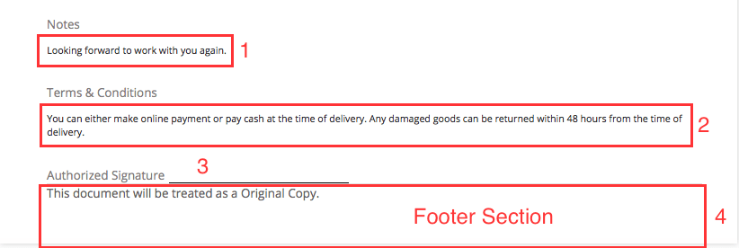 | — | — | — | | Notes | Adjust the Label and Font Size for notes. | Invoices, Quotes, Credit Notes. | | Payment Options | Enable this option to include available online payment methods in the template. | Invoices, Quotes, Credit Notes. | | Add your bank details | Select this option to include your bank account details in the template so that your customers can initiate payments towards this bank account. | Invoices, Quotes, Credit Notes. | | Show Invoice QR Code | Select this option to view the invoice by scanning the QR Code. | Invoices | | Terms and Conditions | Check this option if you want to add terms and conditions to your template. Also customize the Label and Font Size of this field. | All Modules | | Signature | Enable this option if you want to add a signature to your template. You can upload an image of your signature and add a name for it. | All Modules |