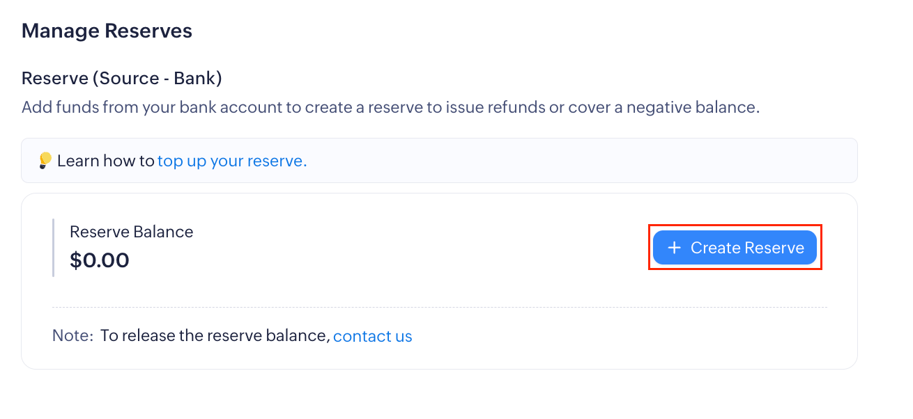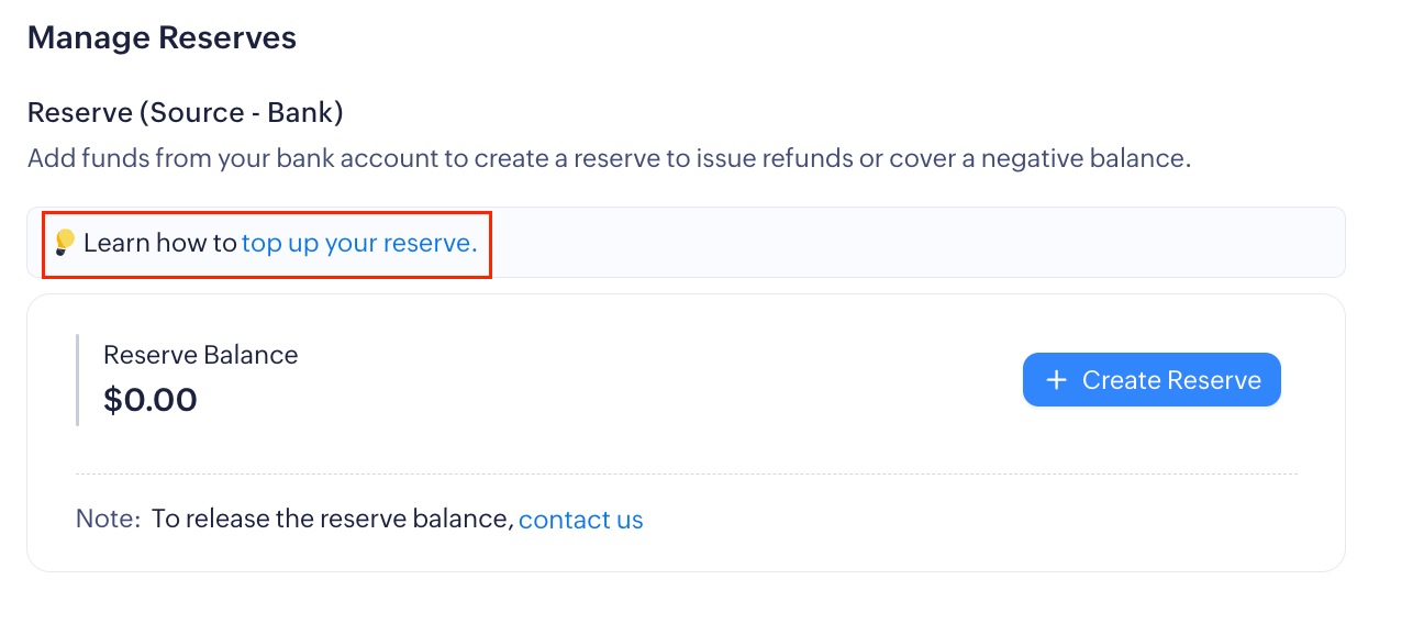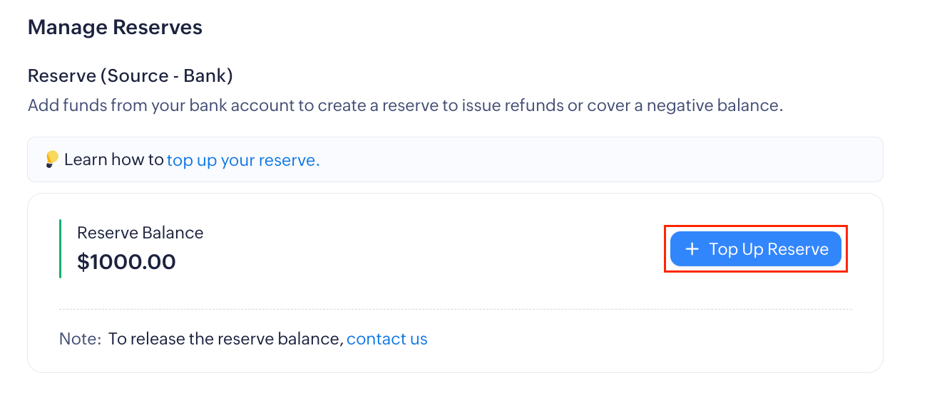 The reserve is a portion of funds you maintain in Zoho Payments to cover potential refunds and chargebacks. You can add to this by topping up funds from your verified bank account to Zoho Payments' bank account.