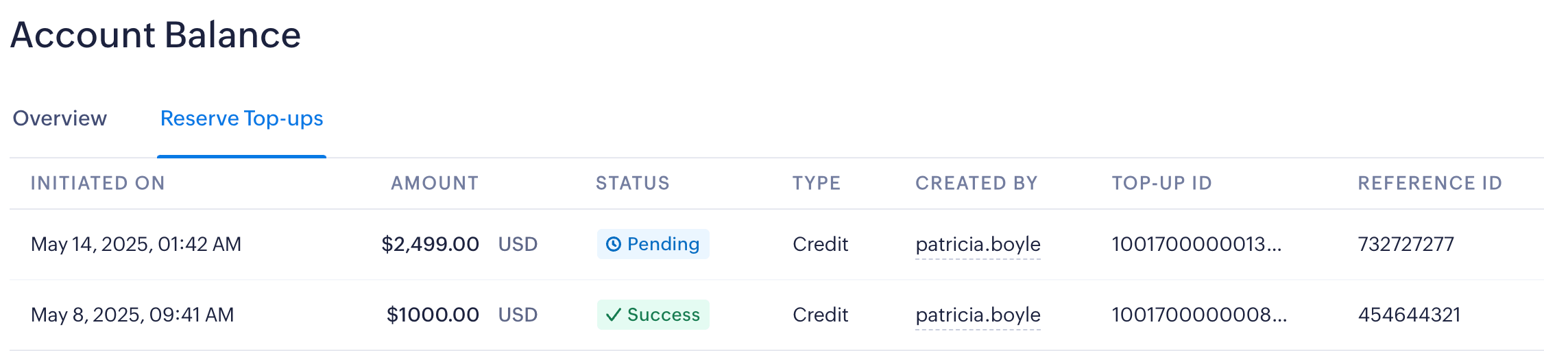 The funds will be reviewed and added to your reserve. You can check the status in the Reserve Top-ups tab. The Account Owner will be notified via email about the success or failure of each reserve top-up.
