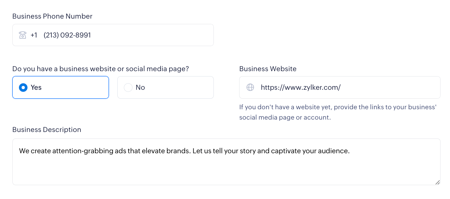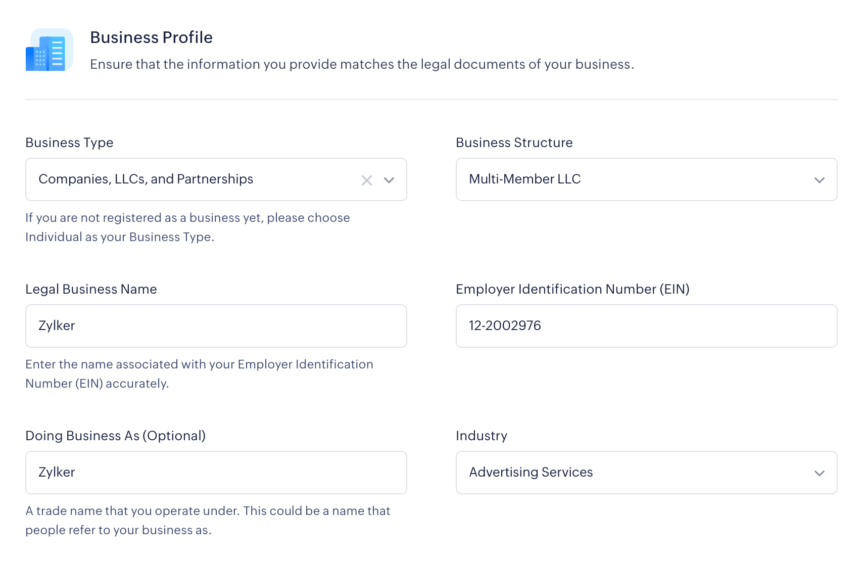 Tell us if your Business Type is Individual, Companies, LLCs, Partnerships, or Nonprofits. Depending on the business type you’ve chosen, the information we collect for creating and verifying your Zoho Payments account will vary.