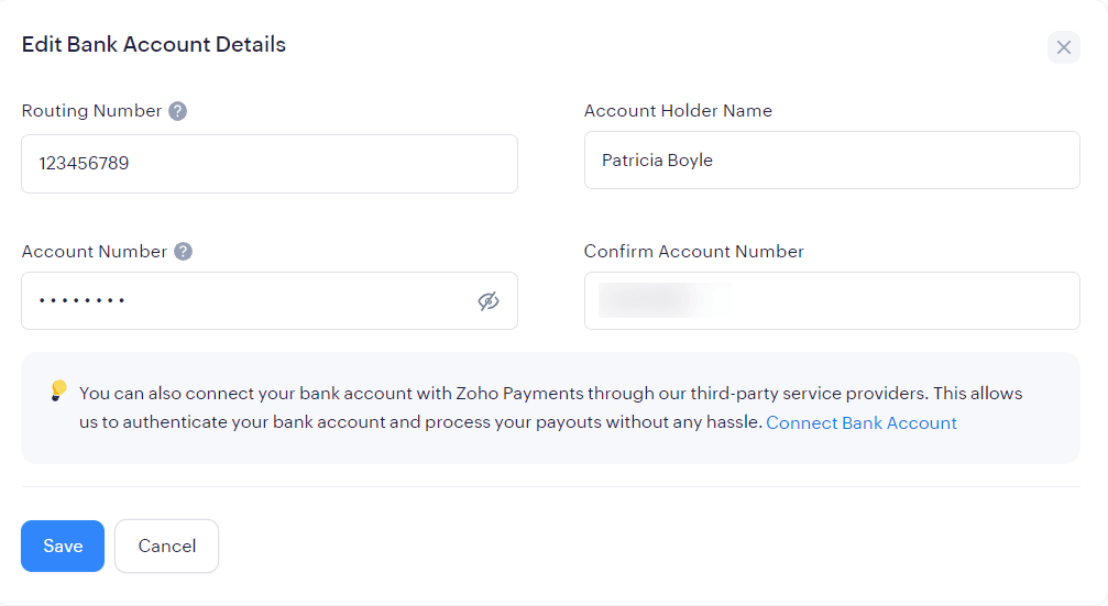 The bank account details will be updated, and future payouts from Zoho Payments will be deposited to the given account after bank account verification. Note that payouts may be temporarily put on hold during the verification process.