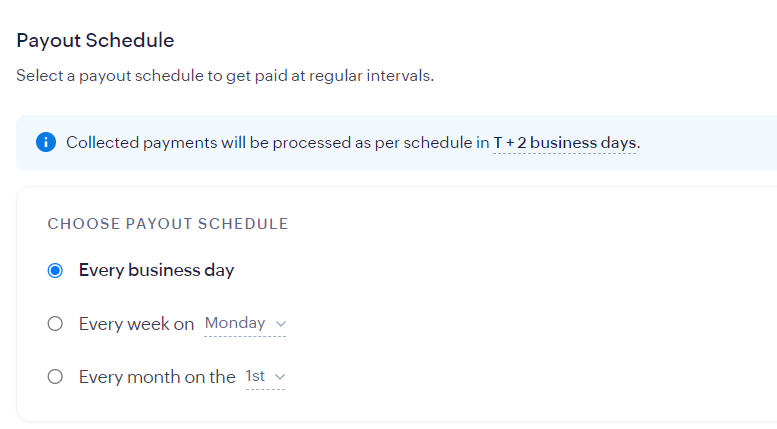 Payout schedule is the interval at which you’d like to receive the payout from Zoho Payments. You can choose to get paid on a daily, weekly or a monthly basis.