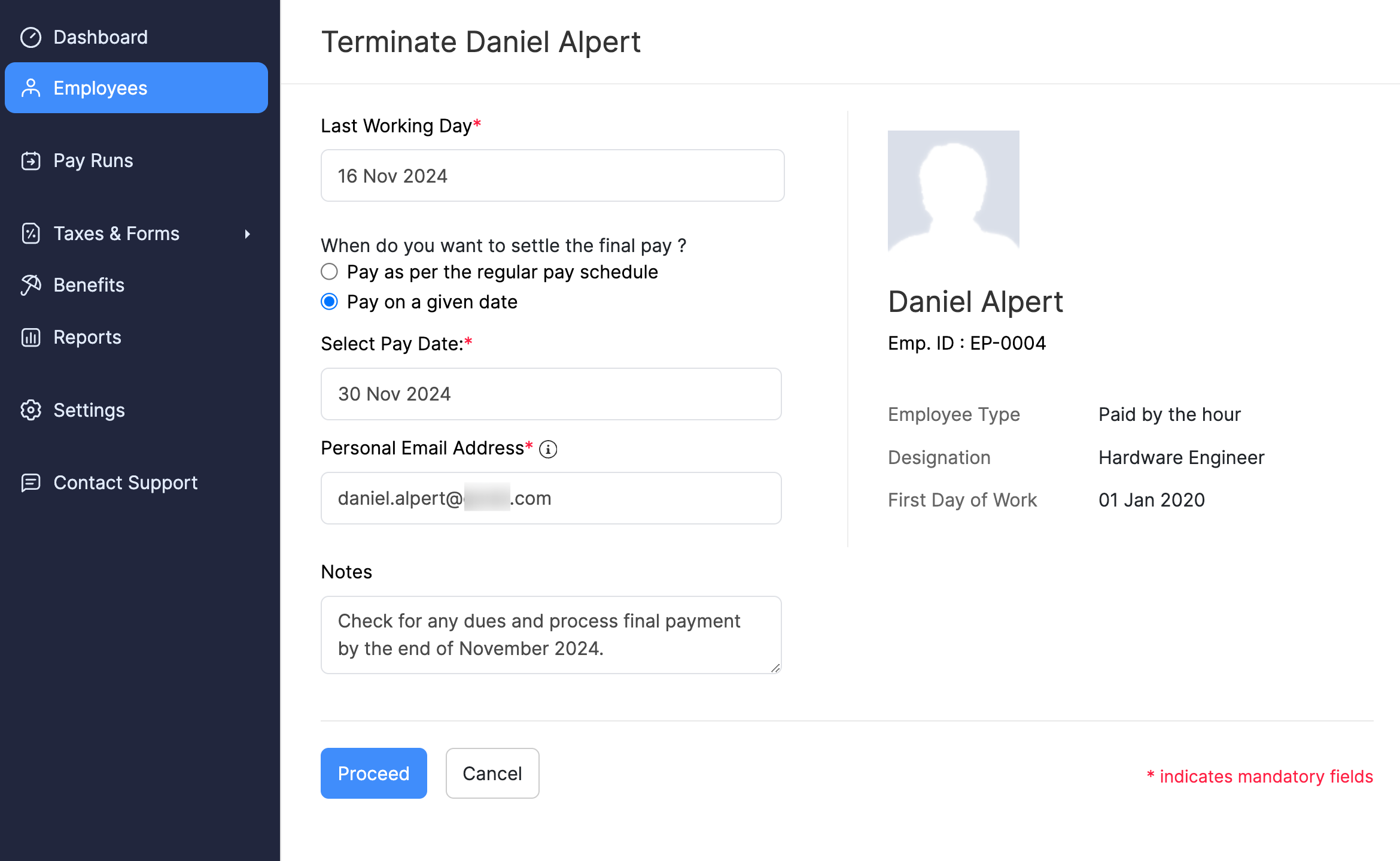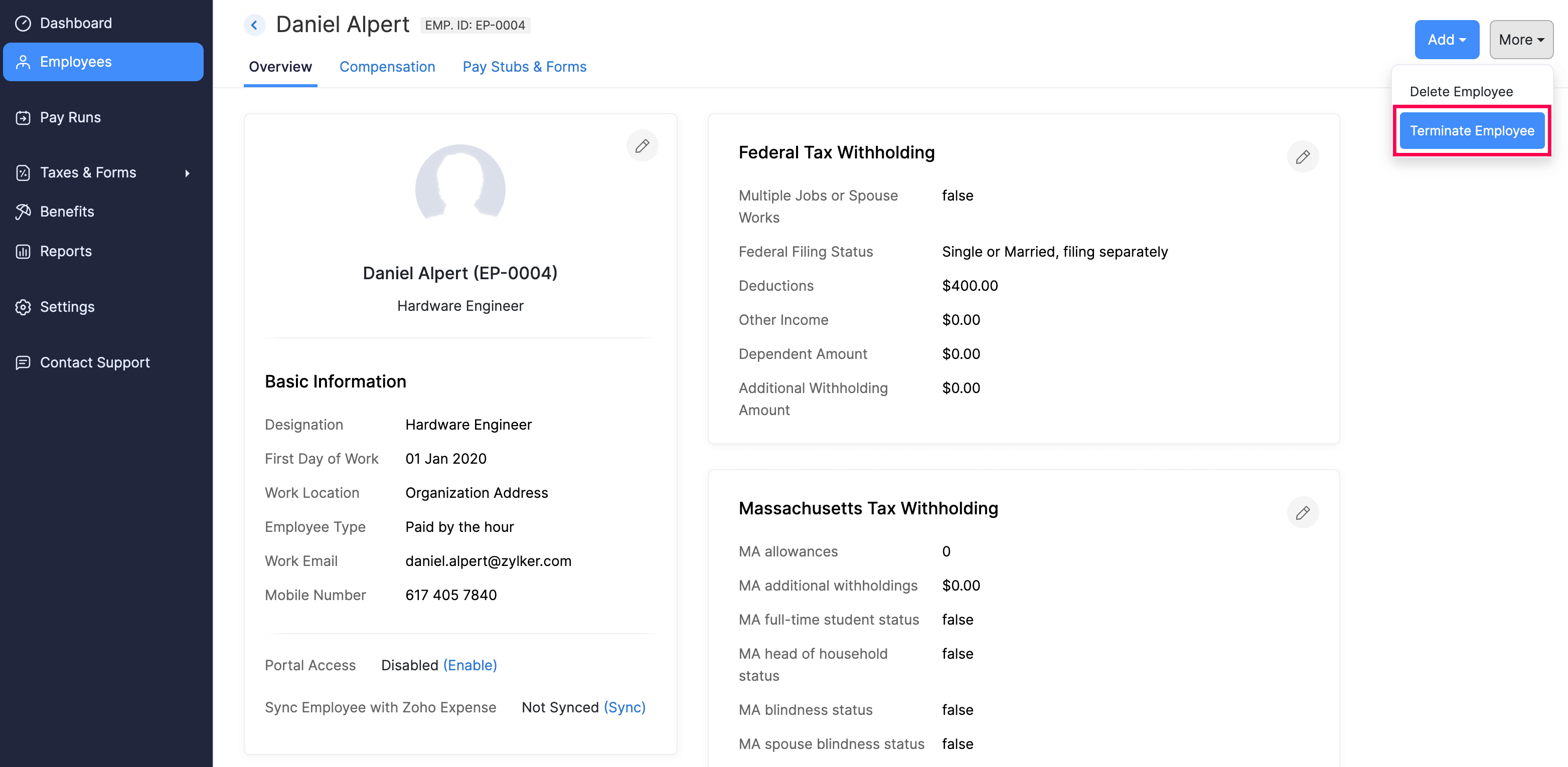 WARNING Termination is permanent, and rehiring the employee is not possible in Zoho Payroll after termination.