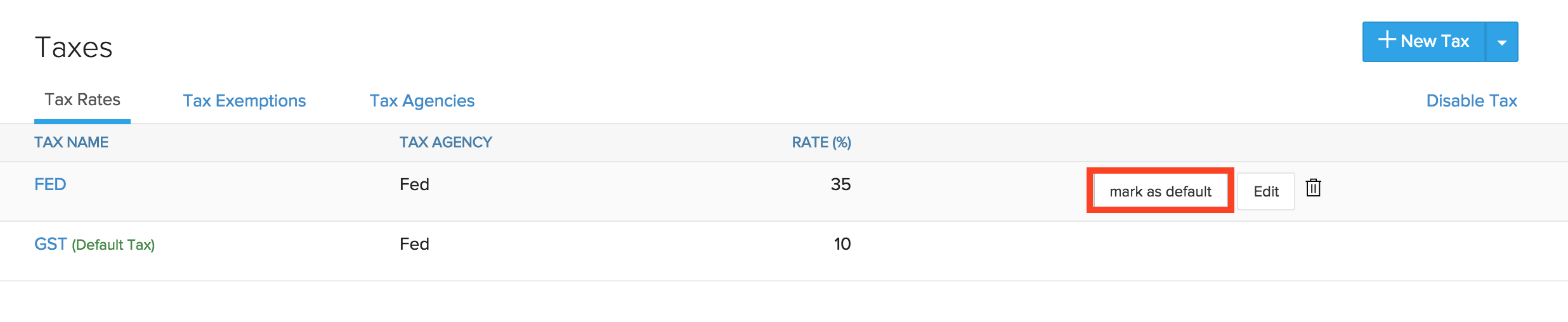 To mark a tax as the default tax, hover the cursor over the tax you want to make it as default and click on the mark as default button.