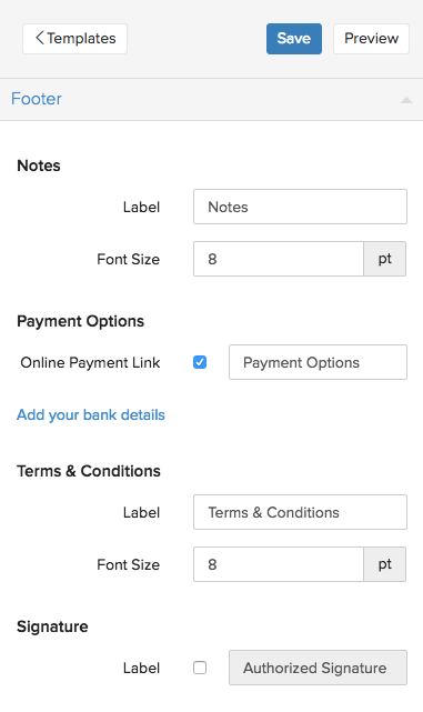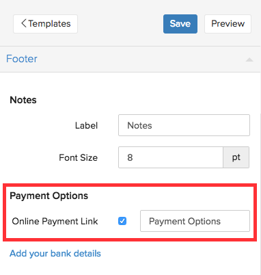 - In the Footer, you can choose to show the Online Payment Options by checking the Online Payment Link box. In case you do not have the option and would opt for a bank transfer or any other offline means, you can add the required details on the template by selecting the Add your bank details option. This will be displayed below the customer notes.
