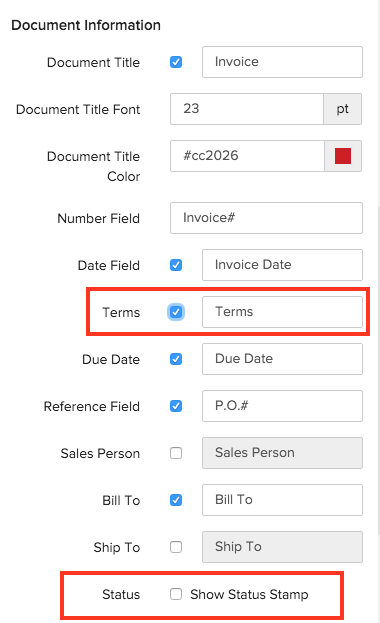 - You can also choose to show the status as a stamp on the invoices by checking the Show Status Stamp option under Header & Document Information.