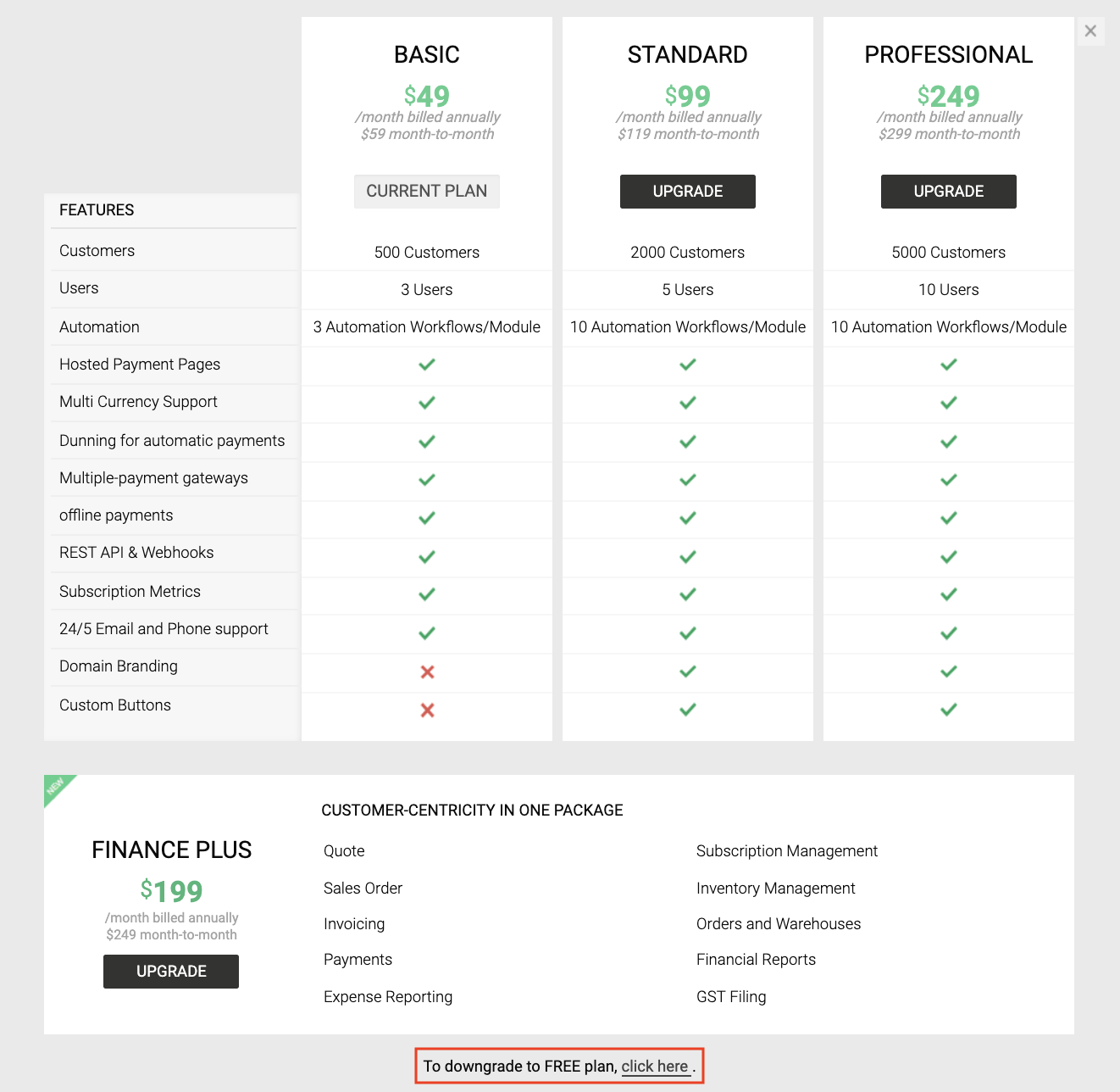 - Select the plan you want to downgrade to by clicking Downgrade under the plan name.