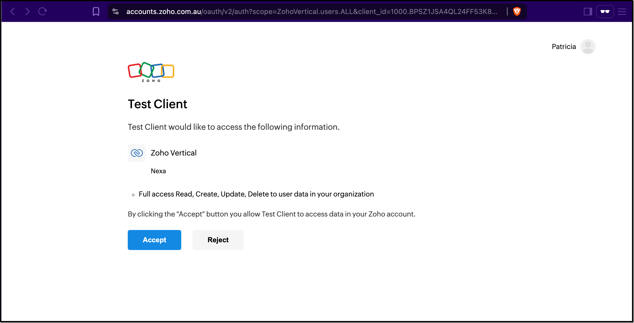 "https://accounts.zoho.com/oauth/v2/auth?scope=ZohoVertical.users.ALL&client_id={client_id}&response_type=code&access_type={"offline"or"online"}&redirect_uri={redirect_uri}"