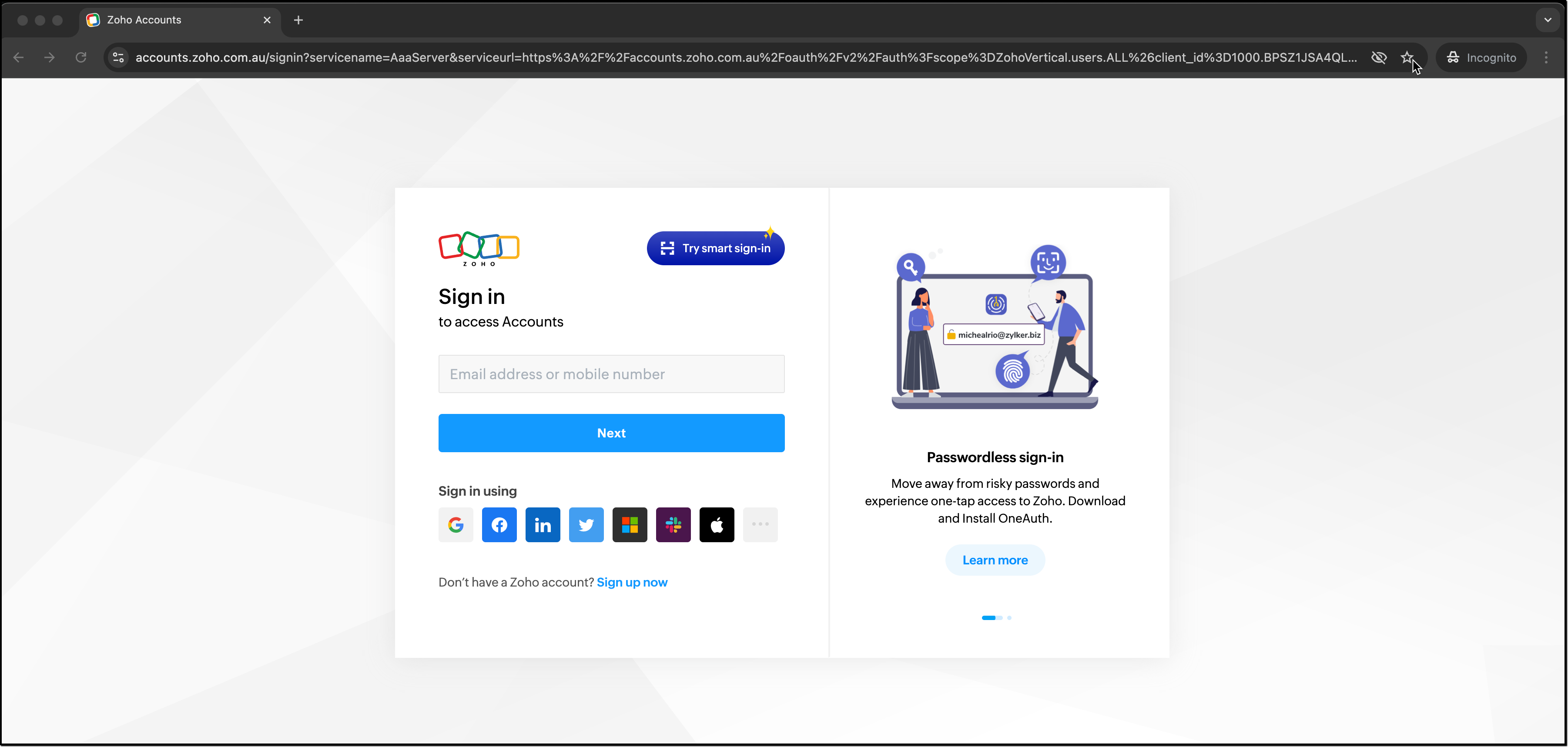 The application redirects the user to the Zoho Login page, and the user enters the Zoho credentials.