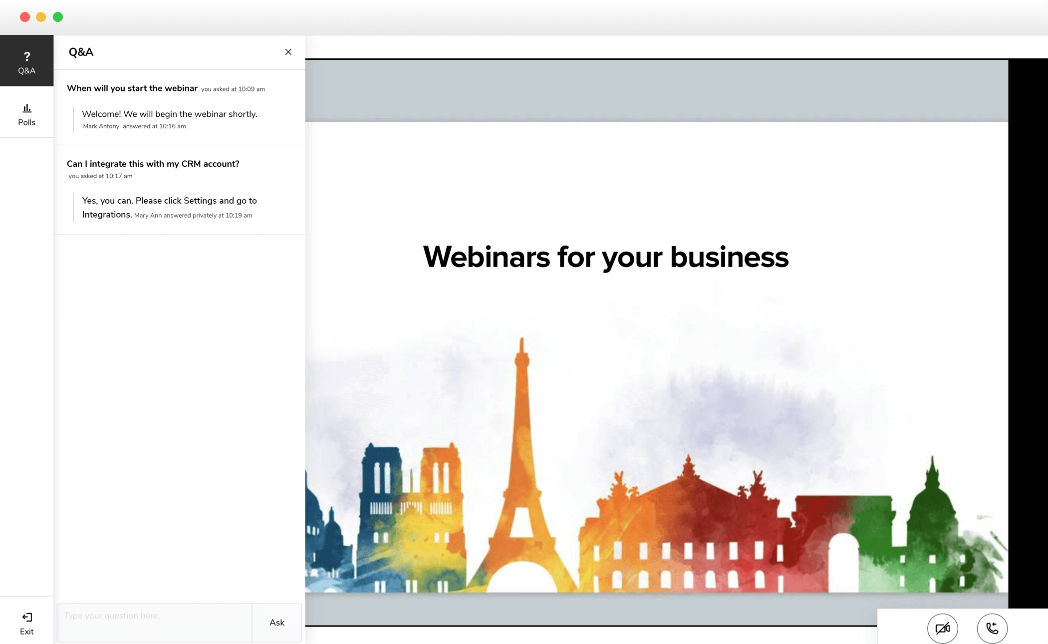 Xem và xuất báo cáo chi tiết về người tham dự, người đăng ký, hỏi đáp và tham gia thăm dò ý kiến. Xác định và theo dõi khách hàng tiềm năng đặc biệt.