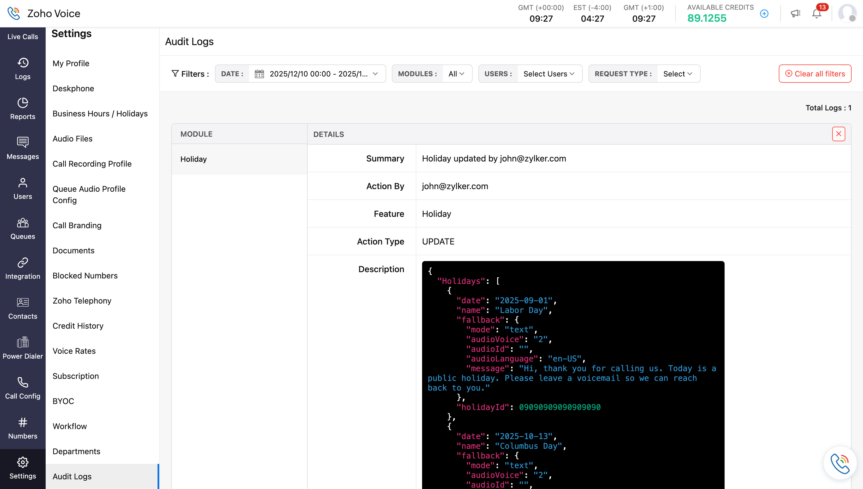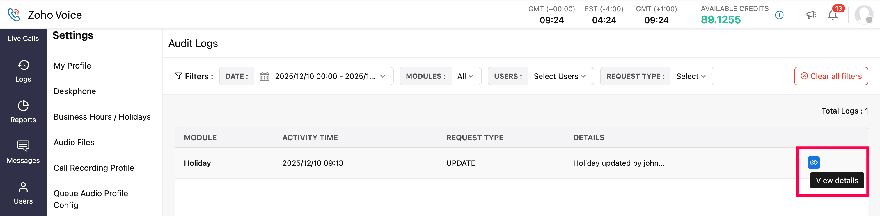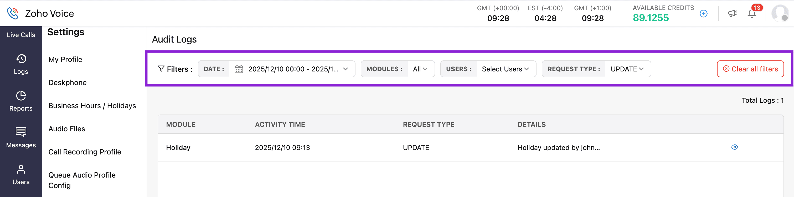 The Audit Logs feature automatically captures the logs of actions performed by users in your organization. These actions include Create, Update, Delete, and Read operations. This feature helps super admins and admins closely monitor which user performed an action for a specific module during a certain period.