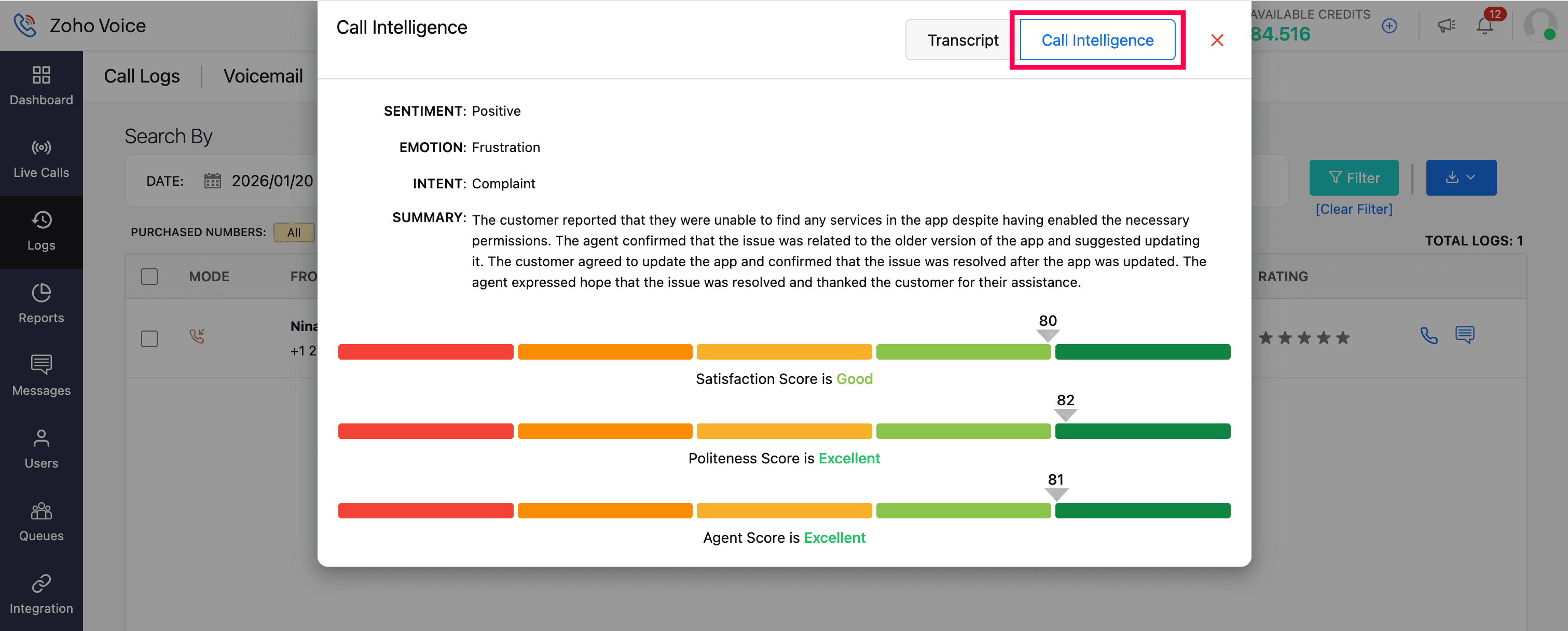 Call Intelligence in Zoho Voice uses Zoho's in-built tool to analyze conversations and extract meaningful insights from recorded calls. It evaluates sentiment, identifies customer intent and emotions, and generates concise summaries for quick understanding. The system also provides call quality metrics, including customer satisfaction, politeness, and agent performance scores.