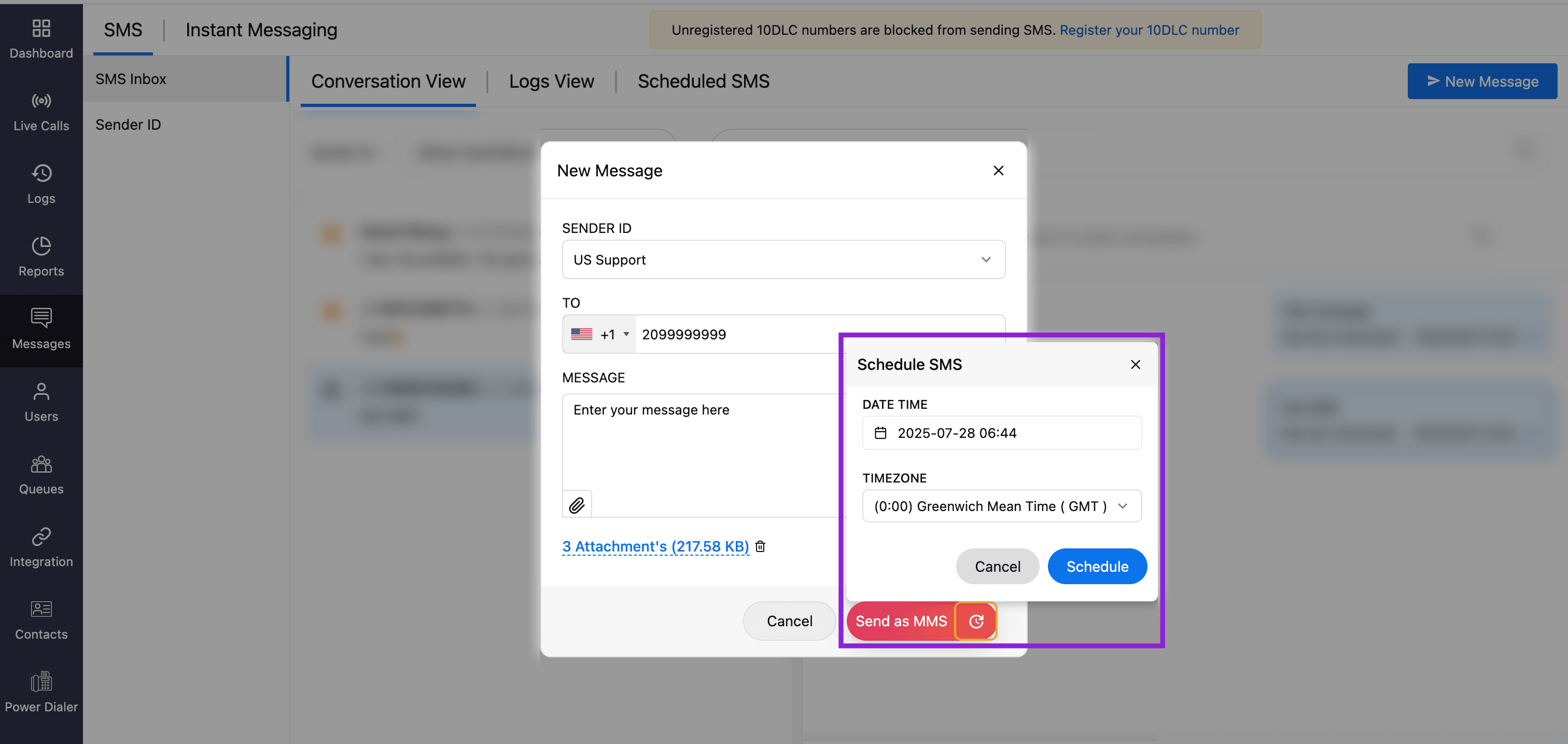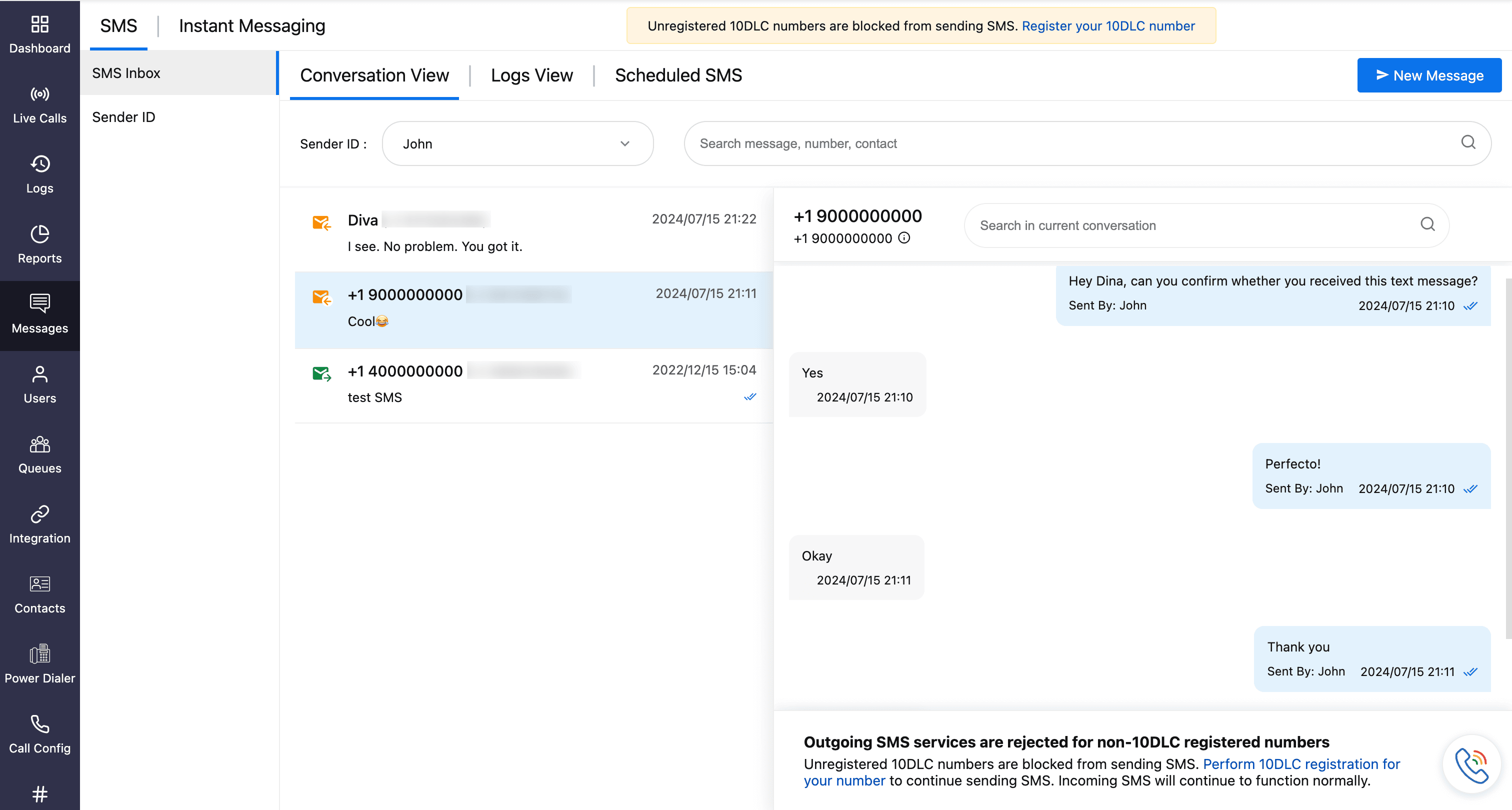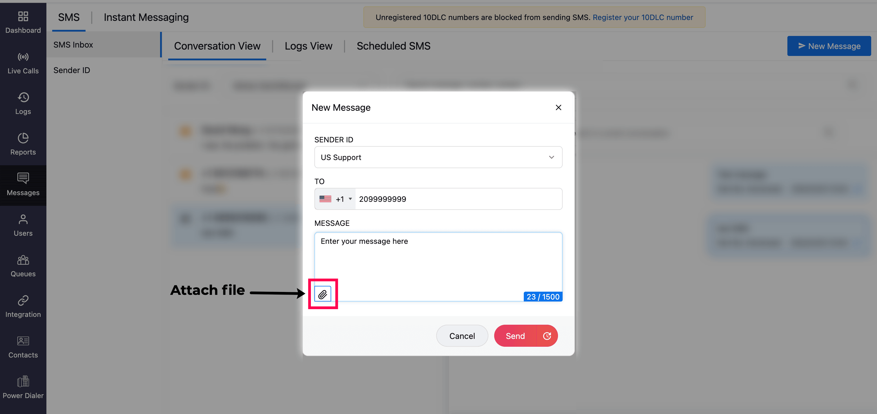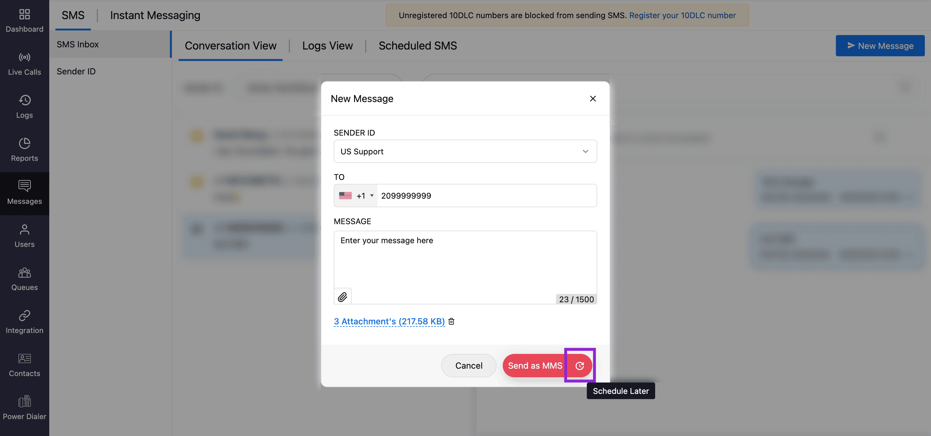Unregistered 10DLC numbers are blocked from sending SMS. Learn more about 10DLC registration.