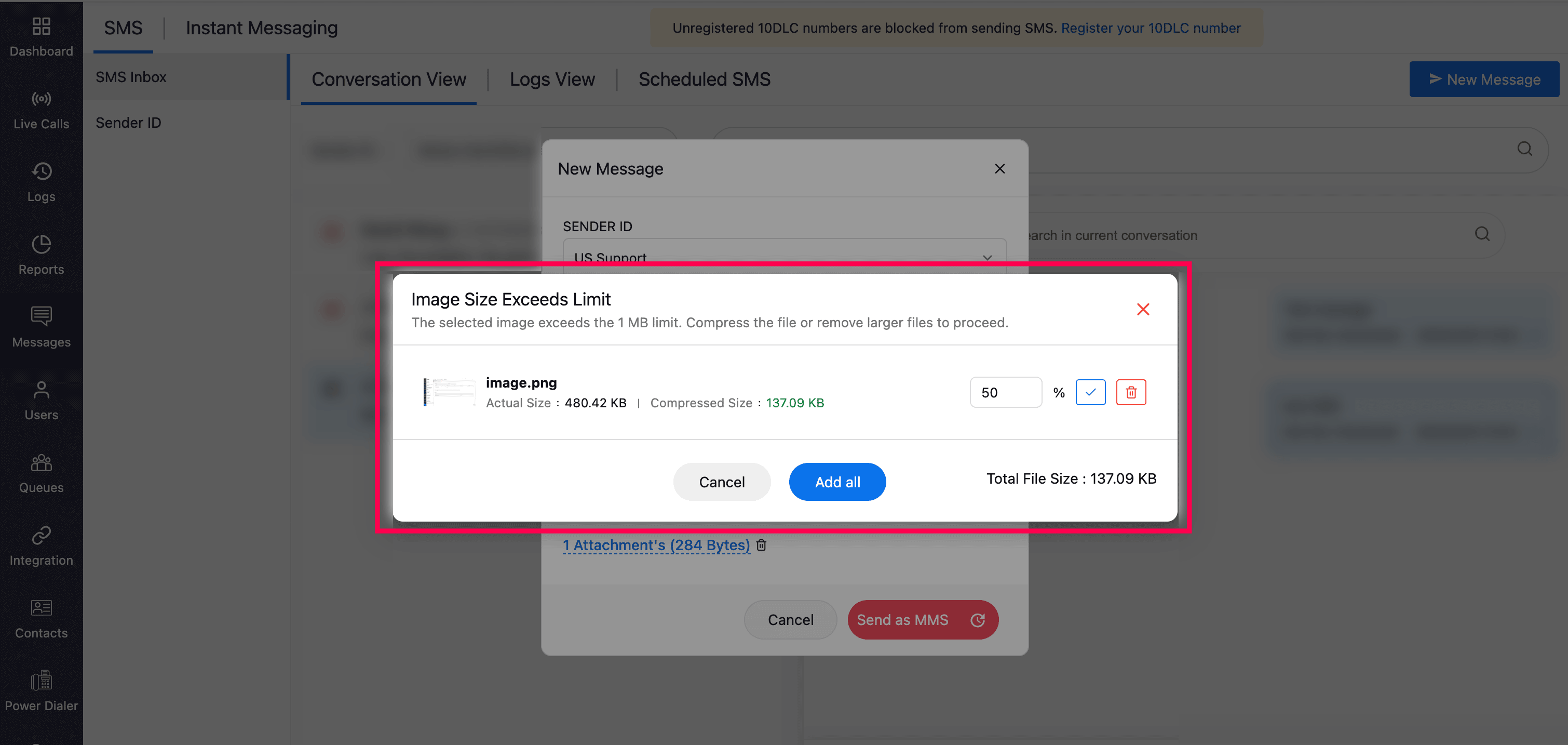 Once your number is SMS/MMS-enabled, you can send and receive SMS and MMS messages from the Messages module and carry out chat-like conversations with your customers and prospects using text and multimedia files.