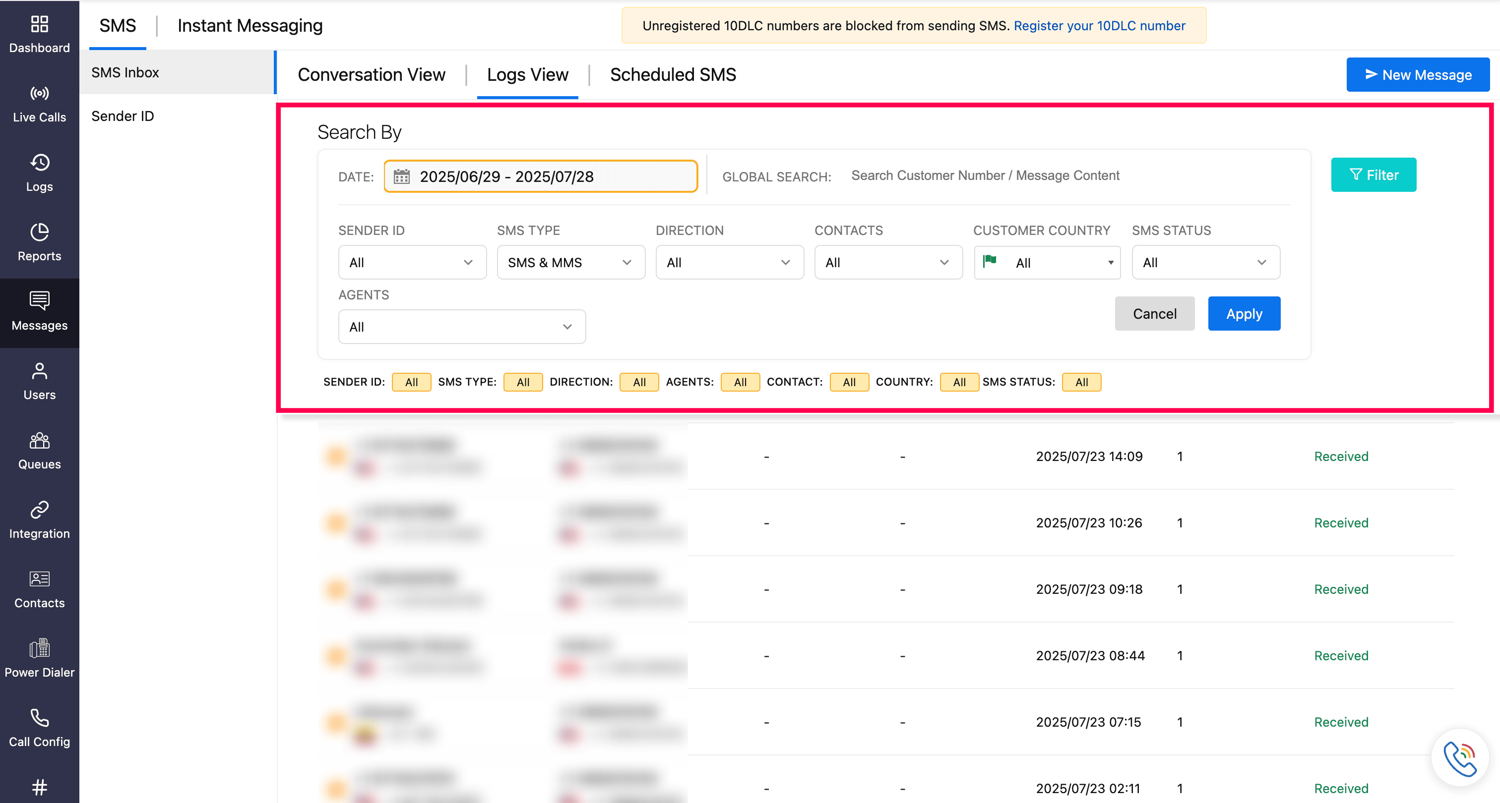 Use advanced filters to narrow down results by Sender ID, SMS Type, Direction (Inbound or Outbound), Customer Country, SMS Status, Contacts, and Agents.
