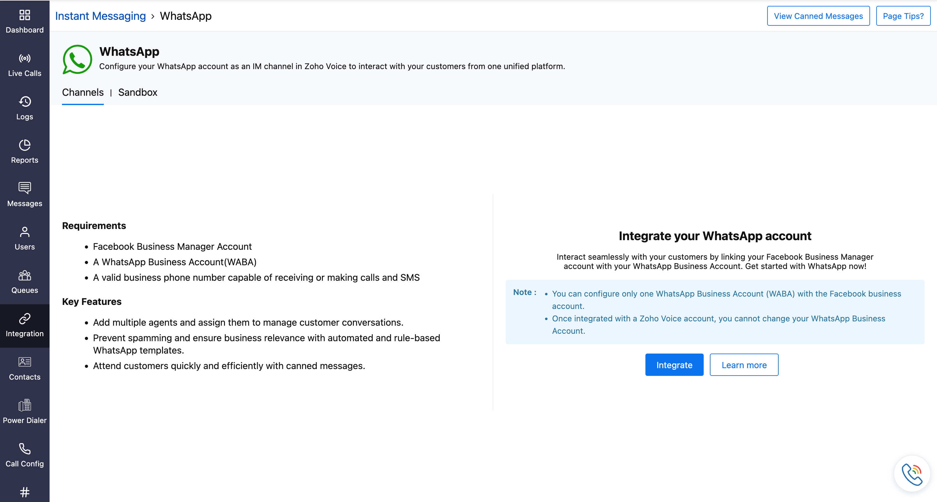 After successful configuration of WhatsApp integration with Zoho Voice, create a channel in the Channels view.