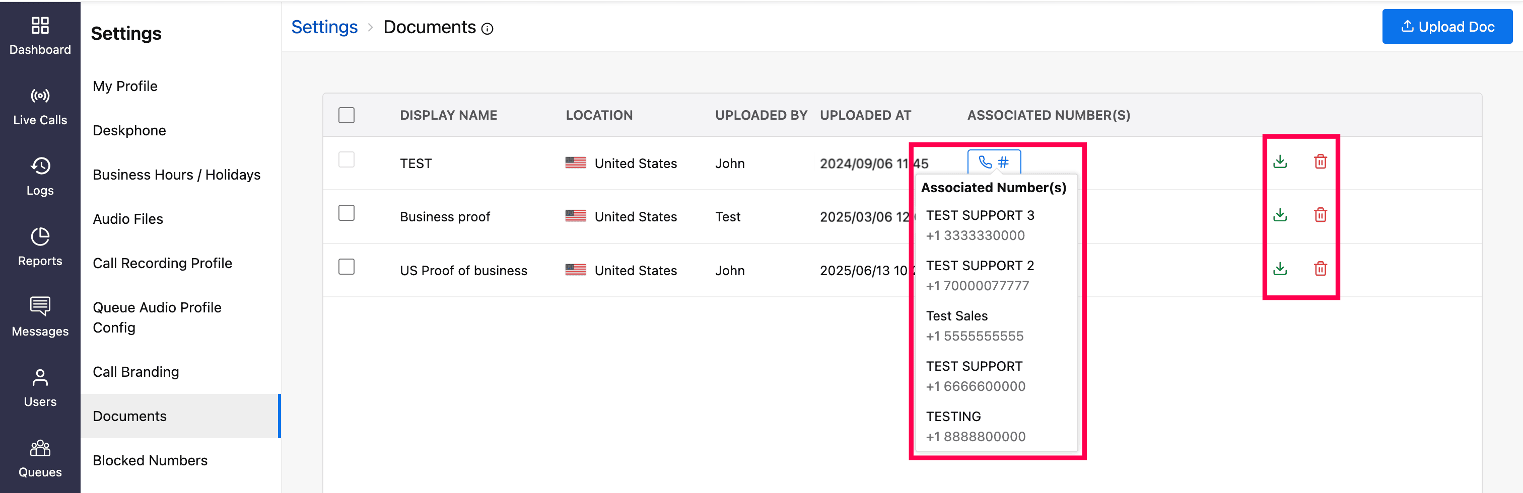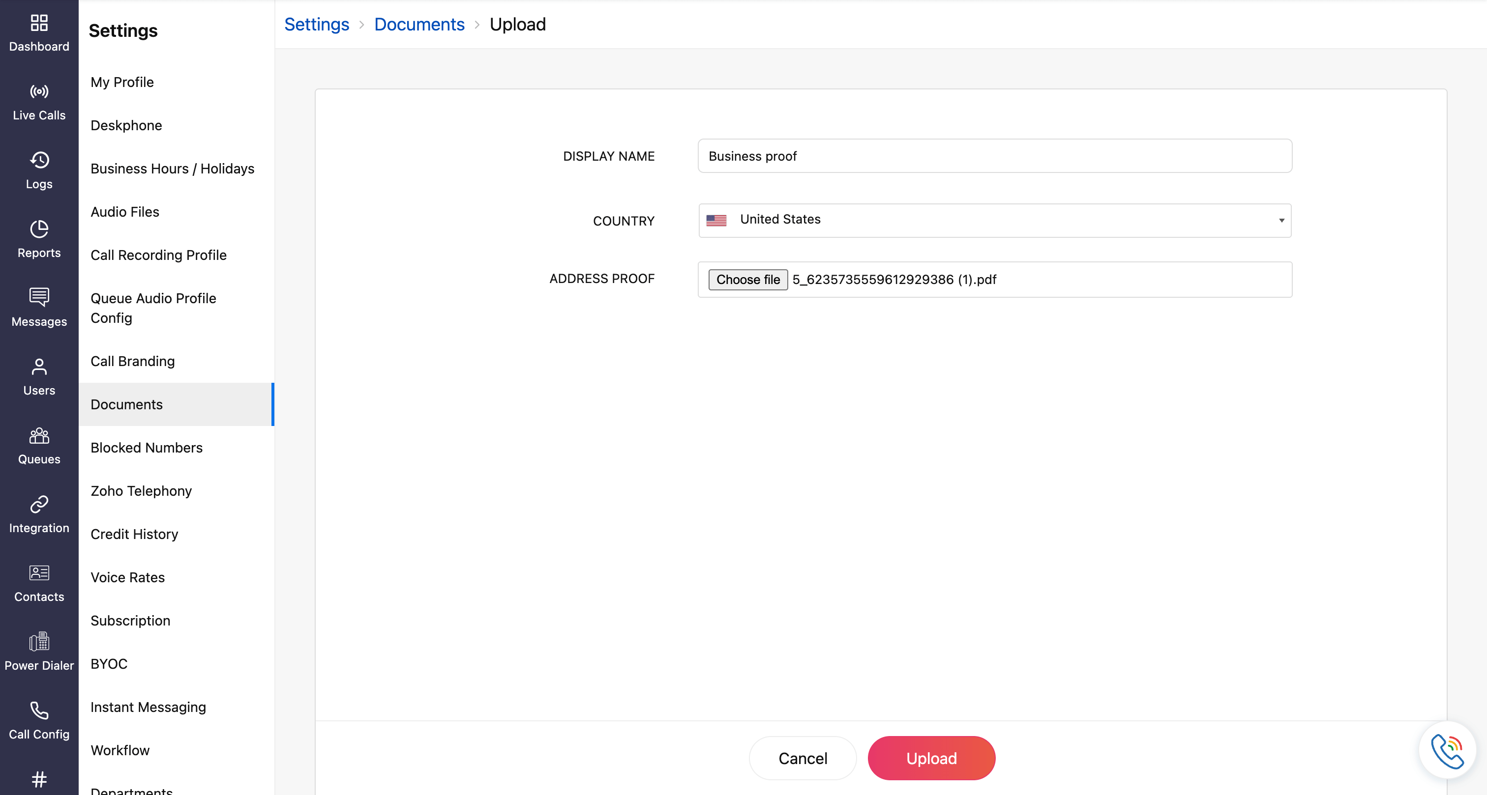 In Zoho Voice, you can upload and manage all required documents in one centralized module. This makes it easy to access them whenever needed, especially during number purchases, where submitting valid documents is mandatory. Uploading documents in advance simplifies the process and ensures you're prepared when purchasing new numbers.