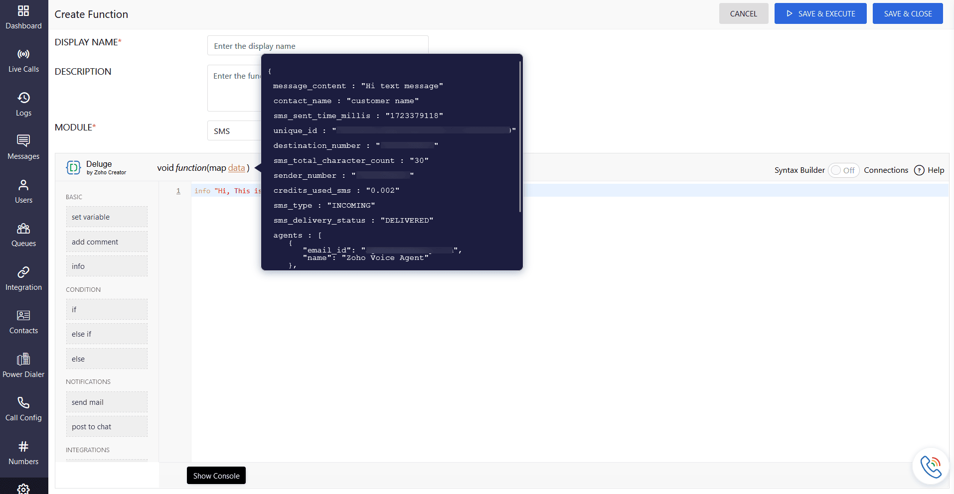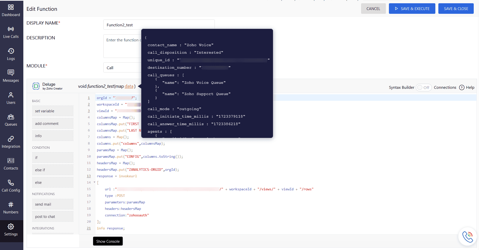 Functions are the building blocks of Deluge scripts that define the specific actions and behaviors of your Zoho Voice connections. They allow you to customize how your connected services interact with Zoho Voice. You can create your own functions or use pre-defined gallery functions designed to post the event logs to the connected services.