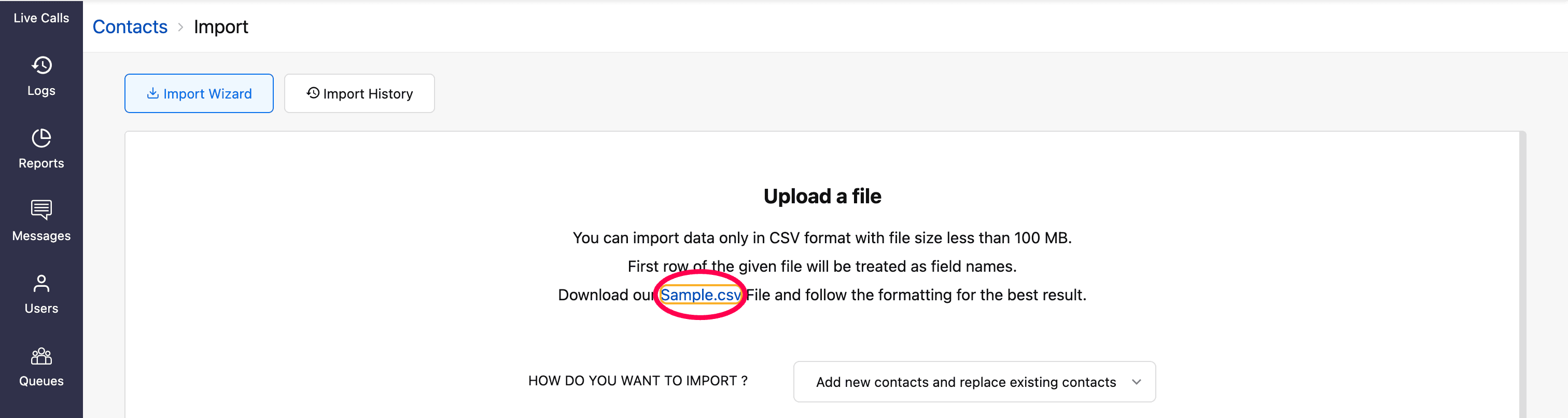 - Add new contacts and replace existing contacts: Imports new contacts from the file and completely replaces all existing contacts in Zoho Voice.