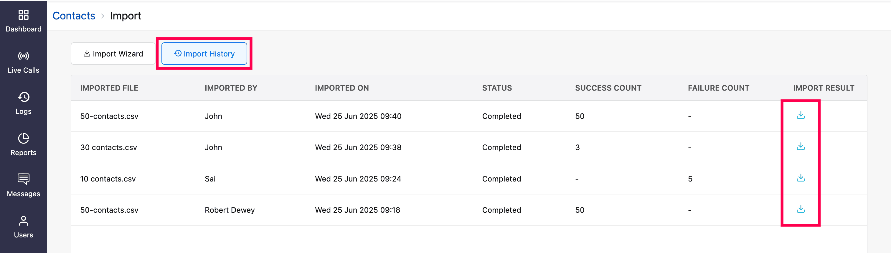 The Import History tab provides a summary of all your import activities and the option to download and review results.