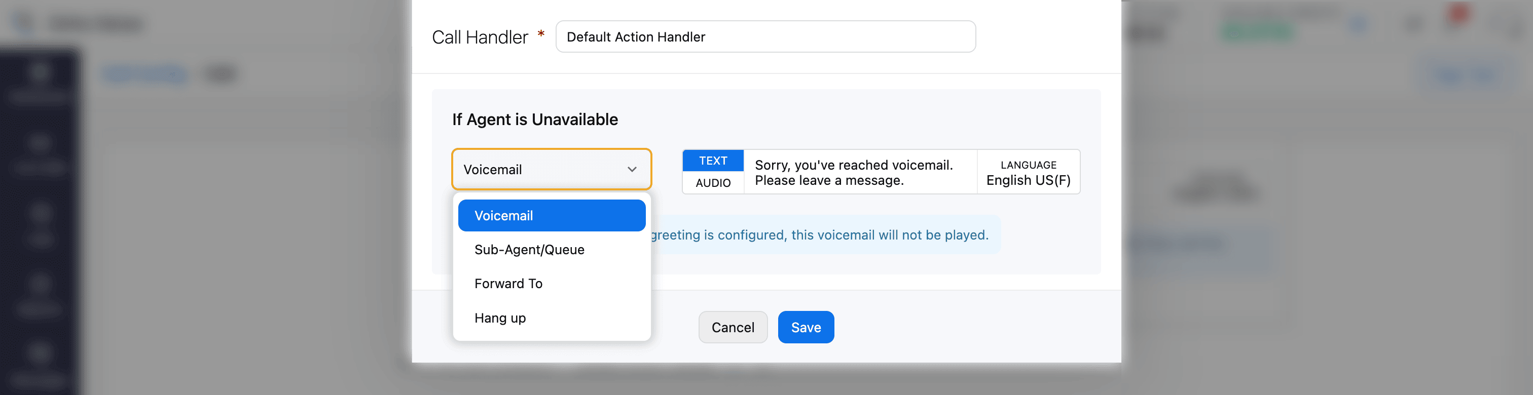 Next, you can define the Call Action Handler, which allows you to define actions when the agent is busy, offline, during holidays, or outside the business hours. You can divert calls to sub-agents, prompt the caller to leave a voicemail, or disconnect the call.