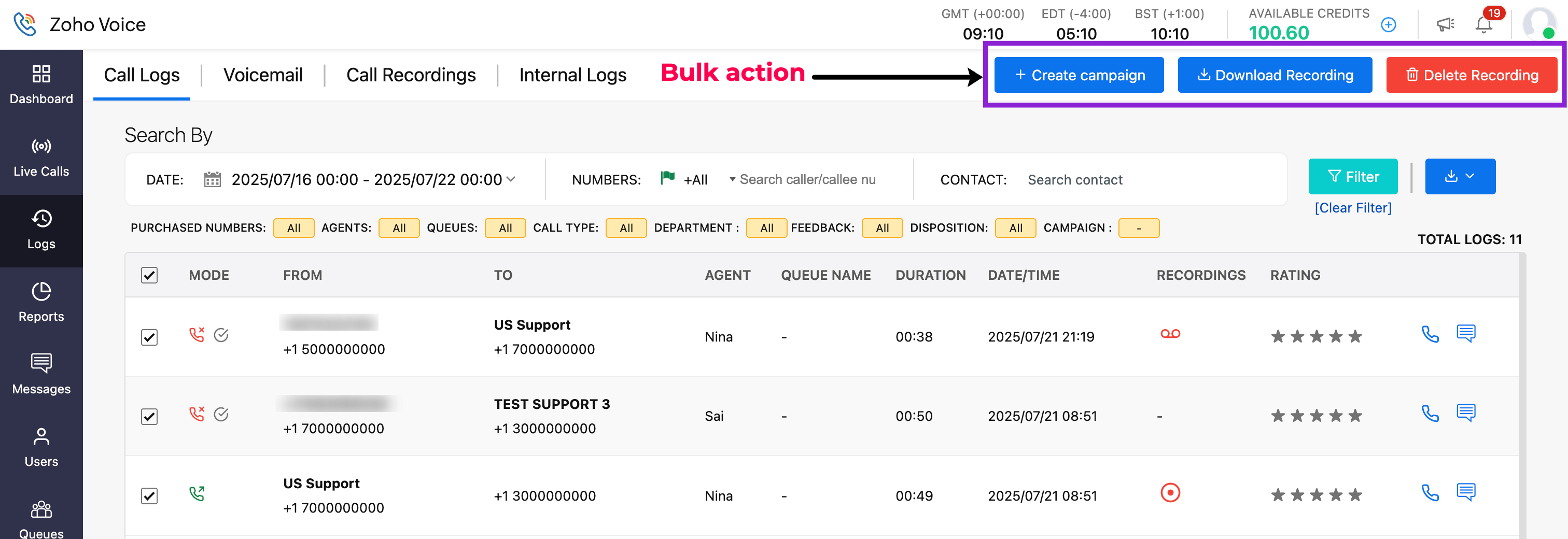 You can select multiple call logs or all logs using the checkboxes and perform the following actions:
