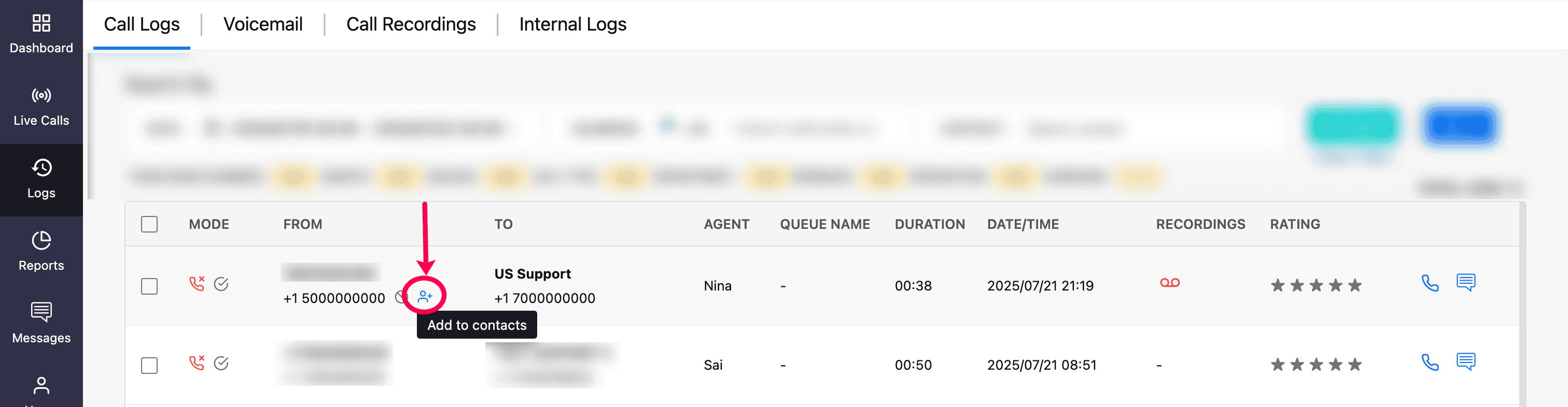 To save a new number to your contact, hover over the number and click the Add Contact icon.