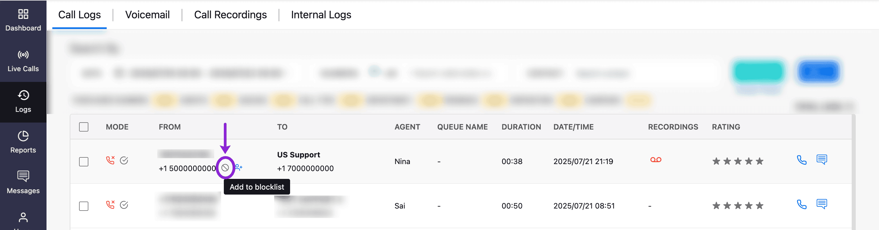 Zoho Voice provides a centralized view and management of your call-related records, including calls, voicemails, call recordings, and internal (agent-to-agent) call logs.