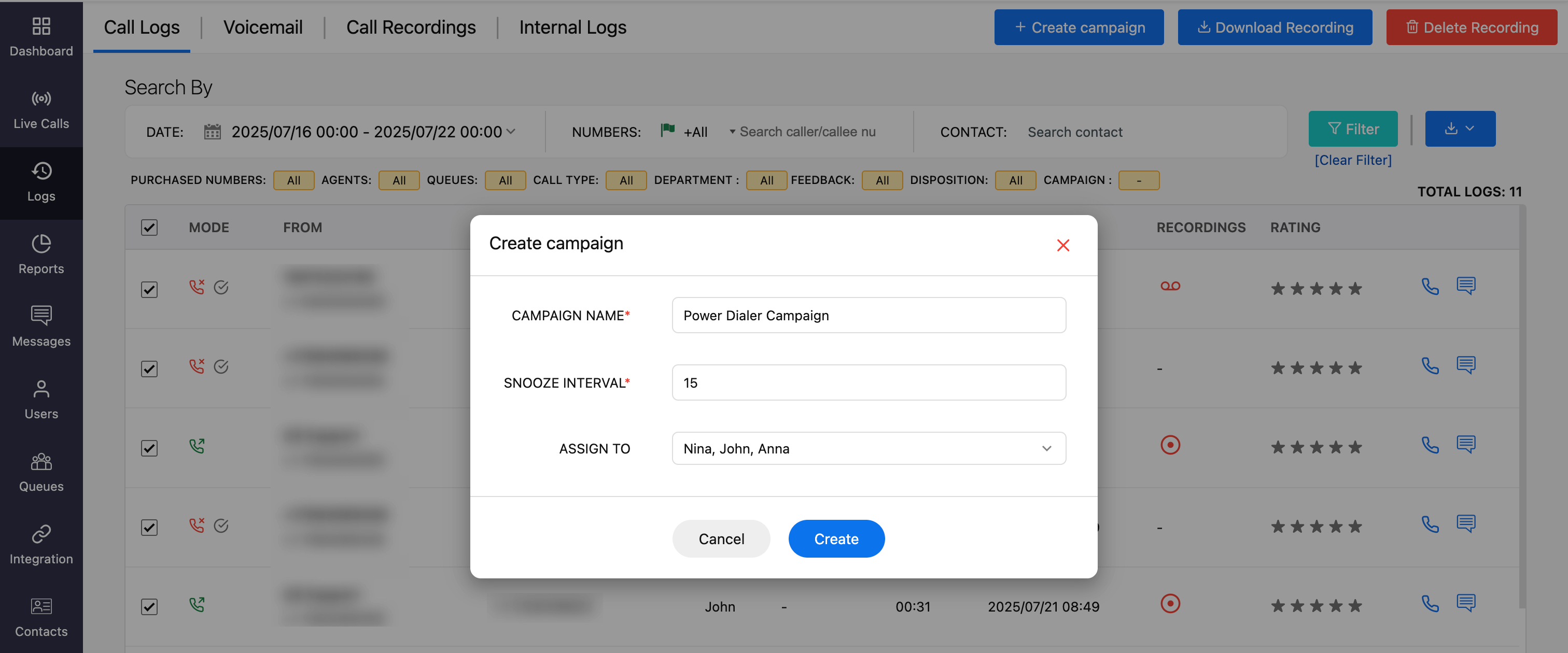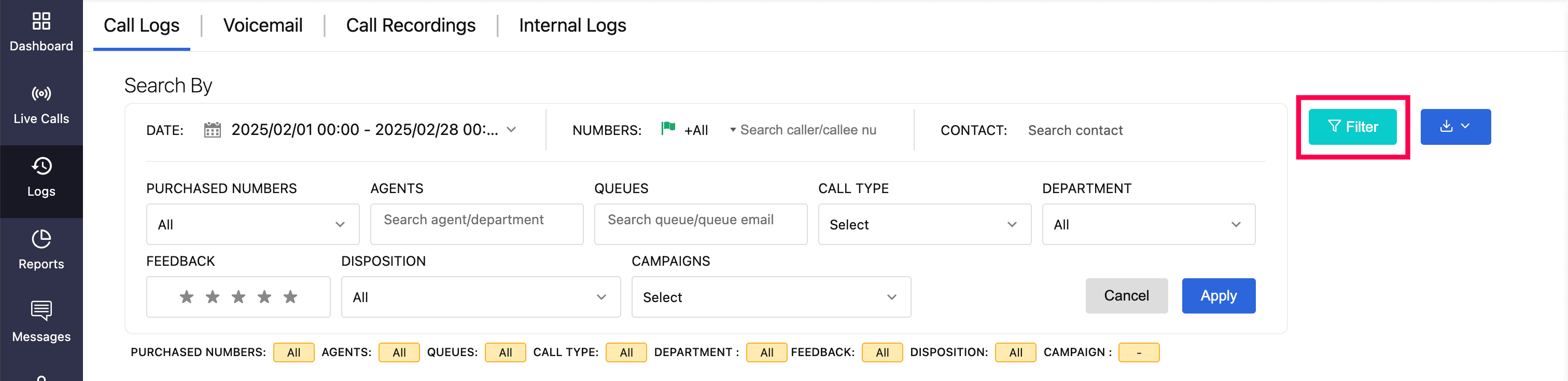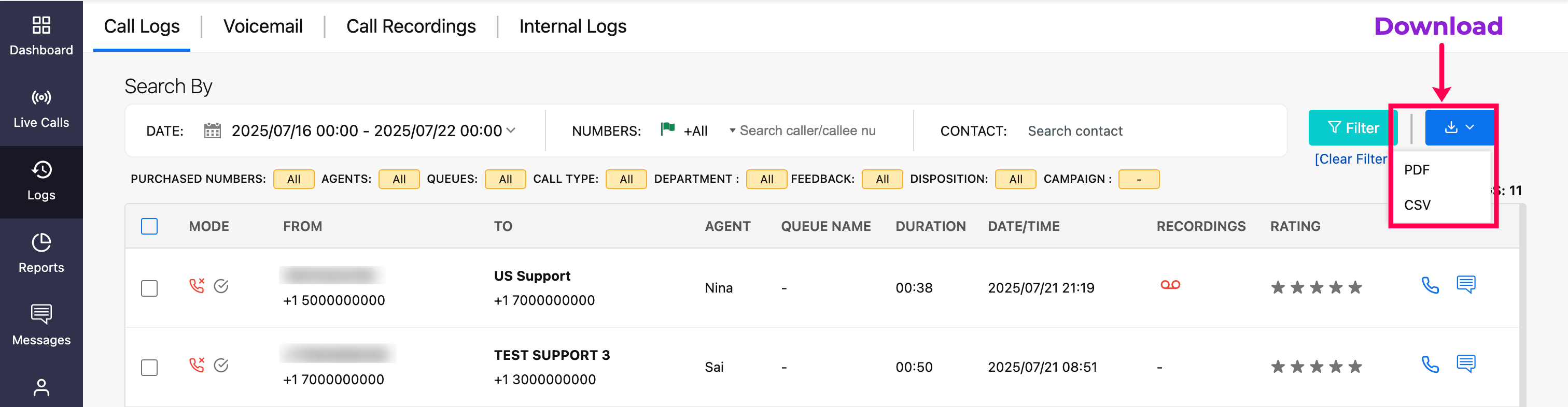 Use the search and filter options to find specific logs by date range, time, phone numbers, or contact names.