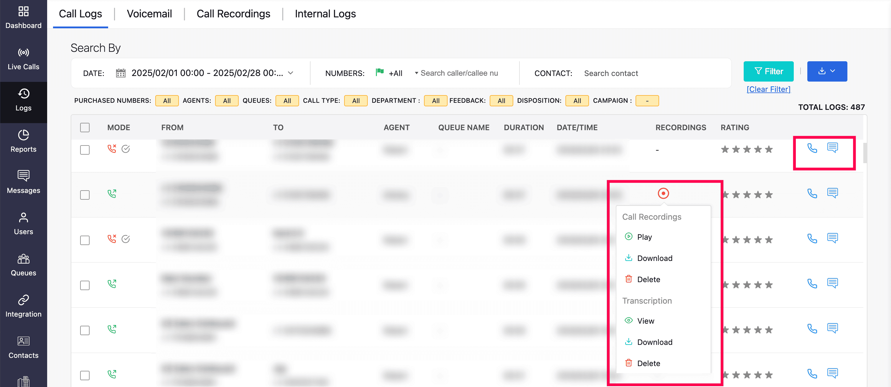 Similarly, you can view and manage voicemail logs, call recording logs, and internal call logs within their respective tabs. Each tab allows you to access relevant details and perform necessary actions.
